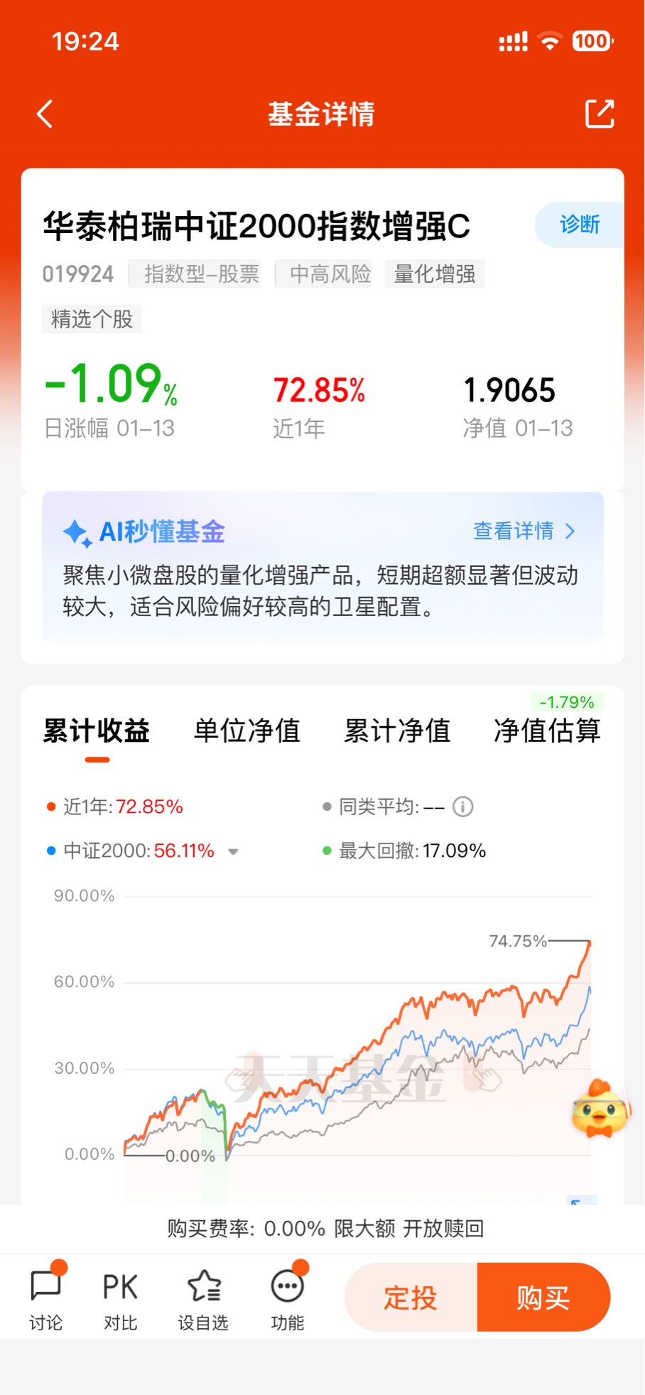 今儿个A股盘面看得人血压飙升,商业航天板块上午的大幅波动,把题材股的不确定性体现得淋漓尽致,前一秒还在涨,下一秒就跌得稀里哗啦。反观我持有的华泰柏瑞,今天就跌了1个点出头,近一年却涨了72.85%,比中证2000指数强多了。它主打小微盘股的量化增强,短期波动确实有,但胜在策略稳、能拿住超额收益,还不用盯着单一板块担惊受怕,想稳稳布局小盘成长的,选它真的没毛病。$华泰柏瑞中证2000指数增强C$ #英伟达礼来联手攻AI制药!概念股大涨#