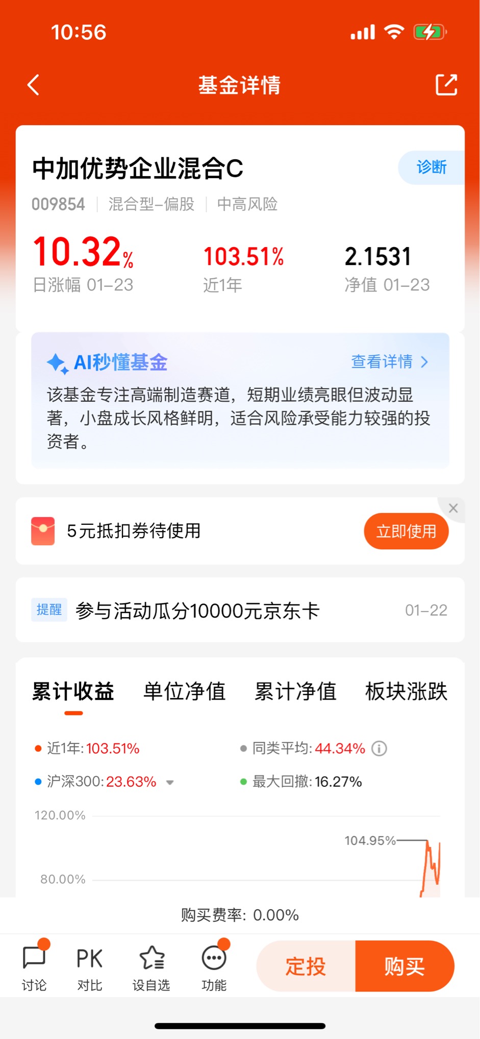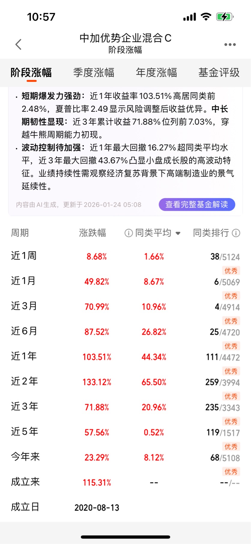 中加优势企业混合C的优势主要有四点。第一,基金经理的投研能力突出,风格灵活。何英慧对周期行业和科技成长股都有深入的理解,近三年换手率超过400%,能够根据市场变化及时调整仓位,在2025年商业航天行情启动前就提前布局相关标的,精准把握了板块的上涨红利。从业绩表现来看,这只基金近一年收益率达到90.08%,近3年涨幅82.04%,大幅跑赢沪深300指数,最大回撤16.27%,在同类混合型基金中属于中上水平,说明基金经理在进攻和防守之间找到了不错的平衡,既能抓住高成长赛道的机会,又能有效控制组合波动。第二,持仓分散度高,风险可控。前十大重仓股占比仅为69.23%,而且覆盖了军工、汽车、电子等多个行业,避免了单一板块波动对组合的影响,即使商业航天板块出现回调,其他行业的持仓也能起到一定的对冲作用。第三,费率结构友好,适合长期持有。作为C类份额,申购费率为0%,持有满30天赎回费率为0%,每年的销售服务费为0.80%,相比A类份额,短期持有成本更低,长期持有也不会产生过高的费用负担,对于想灵活布局又不想频繁交易的投资者来说非常友好。第四,聚焦“优势企业”,选股逻辑清晰。基金的投资目标是重点投资于股票市场各优势行业和优势公司以及有潜力成为未来优势企业的“隐形冠军”,这与商业航天赛道的投资逻辑高度契合,能够精准挖掘产业链中具备核心技术、订单增长明确的优质标的,避免了盲目跟风炒作。