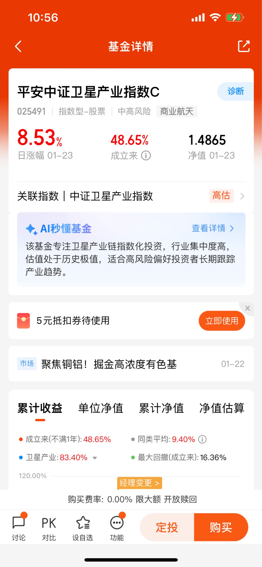 平安中证卫星产业指数C的特点也很明显,主要有四点。第一,覆盖范围广,全面把握板块贝塔收益。指数成分股包括了卫星产业链上的各个环节,无论是上游的元器件制造(如航天电子、臻镭科技)、中游的卫星制造与发射(如中国卫星、蓝箭航天),还是下游的运营服务(如中国卫通),都有涉及,能够全面反映商业航天行业的发展态势,避免了因单一环节波动而错失整个板块的机会。第二,费率低廉,投资成本低。作为指数基金,它的管理费只有0.50%,托管费0.10%,销售服务费0.30%,合计年费率仅0.90%,远低于主动管理型基金的平均水平;而且申购费率为0%,持有满7天赎回费为0%,是目前市场上费率最低的卫星产业指数基金之一,能够最大程度地保留投资收益。第三,流动性好,适合各类投资者。基金规模达到21.89亿元,日均成交额较高,无论是小额定投还是大额资金进出,都不会对基金净值产生明显影响,流动性风险较低,适合普通投资者和机构投资者布局。第四,成立时间短,弹性大,精准踩中风口。这只基金成立于2025年9月,正好赶上了商业航天的爆发期,成立以来截至2026年1月,收益率已经达到48.65%,表现非常亮眼,充分体现了指数基金在热门赛道上的高弹性优势,能够快速分享板块上涨的红利。
