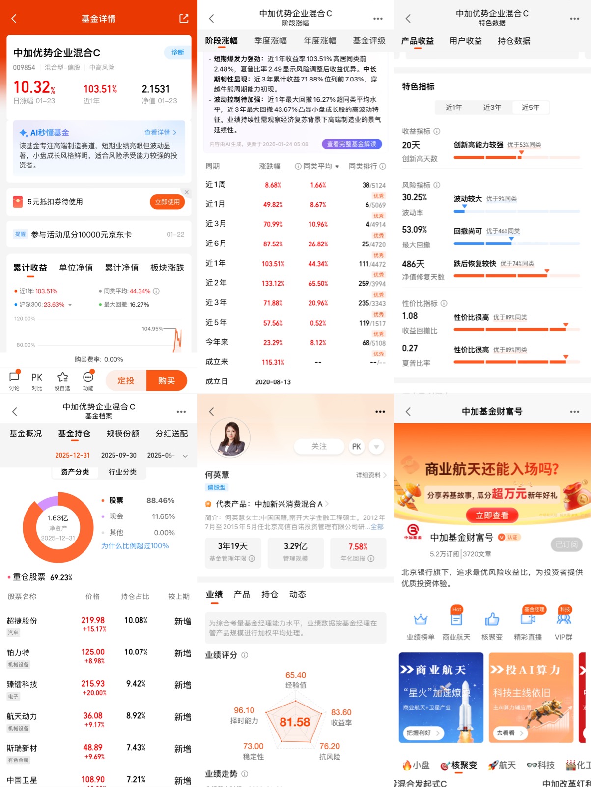 先说说中加优势企业混合C(009854)。这是一只主动管理型基金,成立于2020年8月13日,目前的管理规模约0.43亿元,属于偏中小规模的混合型基金,托管人为中国工商银行。基金经理何英慧拥有近10年的投研经验,曾在景顺长城等头部基金公司任职,擅长挖掘高景气度、高成长的行业,她的投资框架是“核心+卫星”,核心资产选择具备长期竞争力的行业龙头,卫星资产则布局高弹性的细分赛道,比如商业航天、军工、高端制造等领域。从最新的2025年三季报持仓来看,这只基金的前十大重仓股包括超捷股份、铂力特、臻镭科技、中国卫星、航天动力等,覆盖了军工、汽车、电子等多个领域,其中商业航天相关标的占比超过30%,既有中国卫星、航天动力这样的国家队核心资产,也有臻镭科技、斯瑞新材这样的细分领域“隐形冠军”,这种“大树底下好乘凉”的策略,既保证了组合的稳定性,又能捕捉到细分赛道的爆发机会。