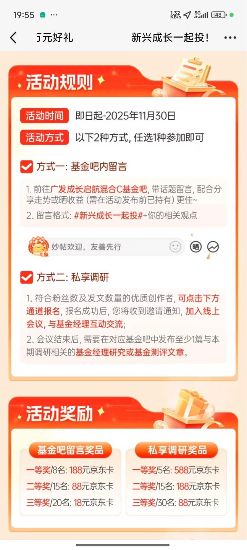 #新兴成长一起投#又来薅基金公司羊毛了,广发基金那边,发个带#新兴成长一起投# 的话题,晒持仓或者观点就能抽奖,门槛不高,奖金大,喝杯奶茶够了$广发成长启航混合C$