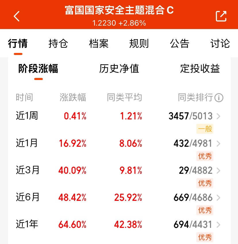 乘着权益市场高涨的东风,富国国家安全主题混合 C 迎来大爆发!今日估值劲涨 5.12%,近 3 月 40.09%、近 6 月 48.42% 的涨幅,让各周期业绩都稳居前列。聚焦国家安全核心赛道布局,精准把握板块红利,在市场行情中稳步向上,业绩表现一路开挂,不愧是布局国家安全领域的优质之选!