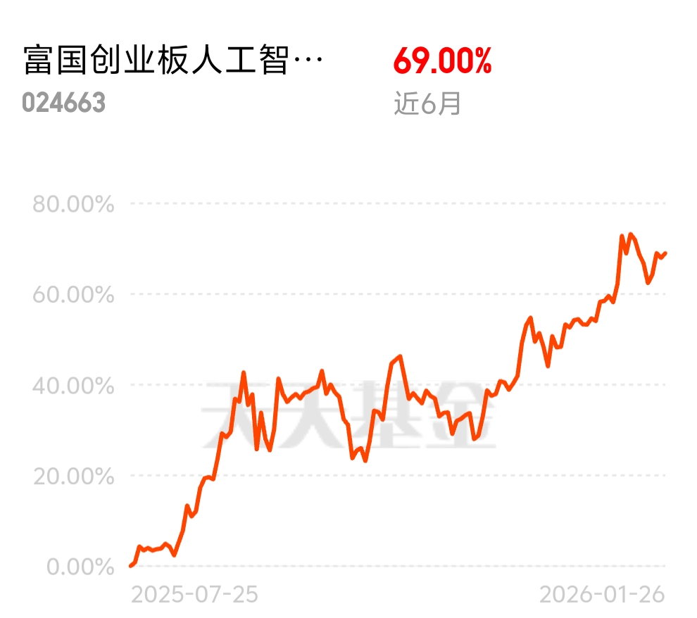 市场一动,差别就出来了。同样是投AI方向,富国创业板人工智能ETF联接C近6个月涨69%,大幅跑赢多数同类产品,昨天还跟着大盘反弹了一波。它不搞分开押注,而是专注创业板人工智能指数成分股,持仓逻辑清晰。近1周收益1.4%,说明流动性好,反应快。这种产品不适合短期炒作,但放在组合里作为科技成长的一部分,长期观察下来挺有韧性。$富国创业板人工智能ETF发起式联接C$