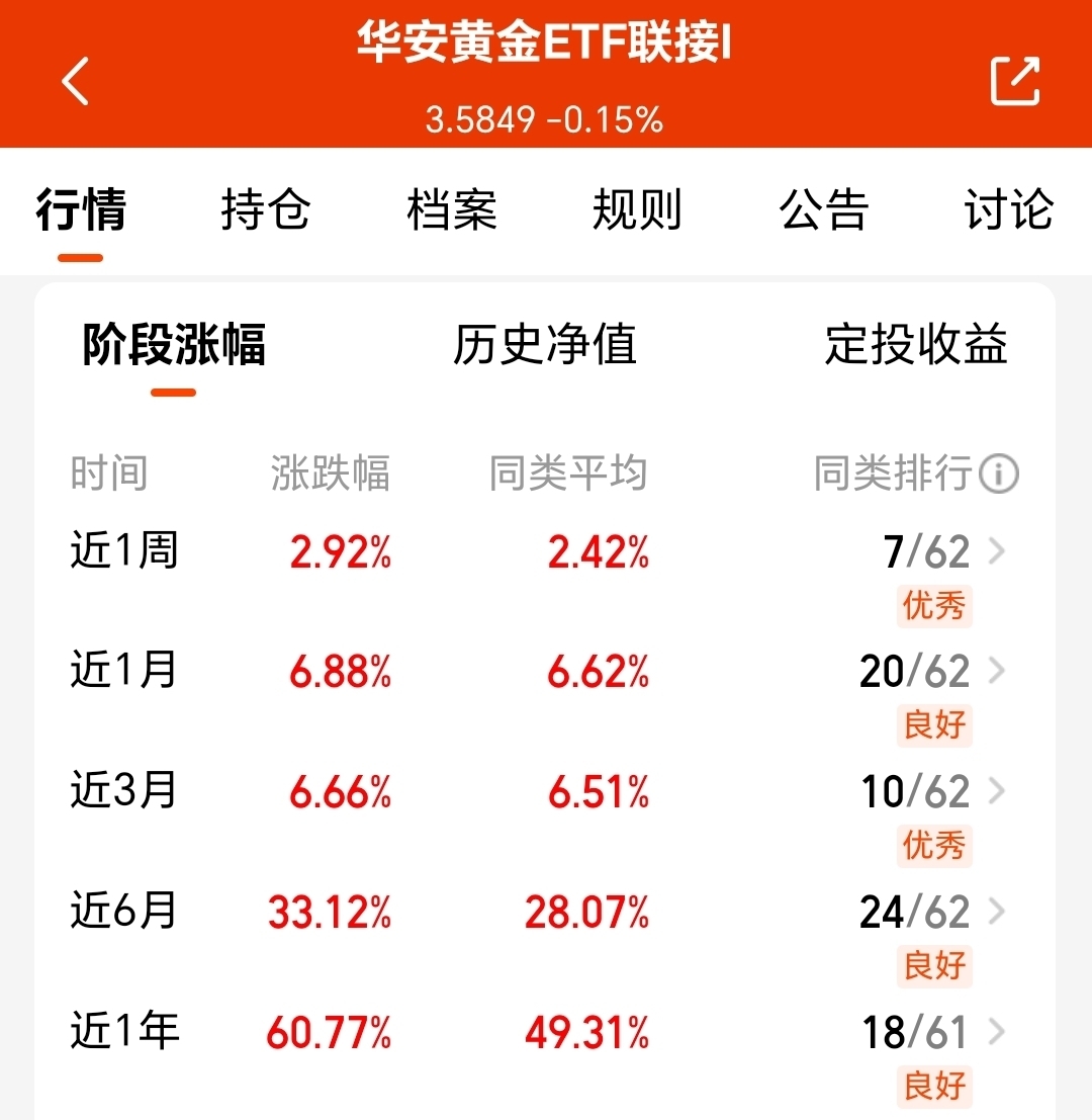 全球震荡下黄金成避风港,$华安黄金ETF联接I$ 年涨 60.77%,亚洲最大规模黄金基,低费率 + 抗风险,长期持有享金价红利