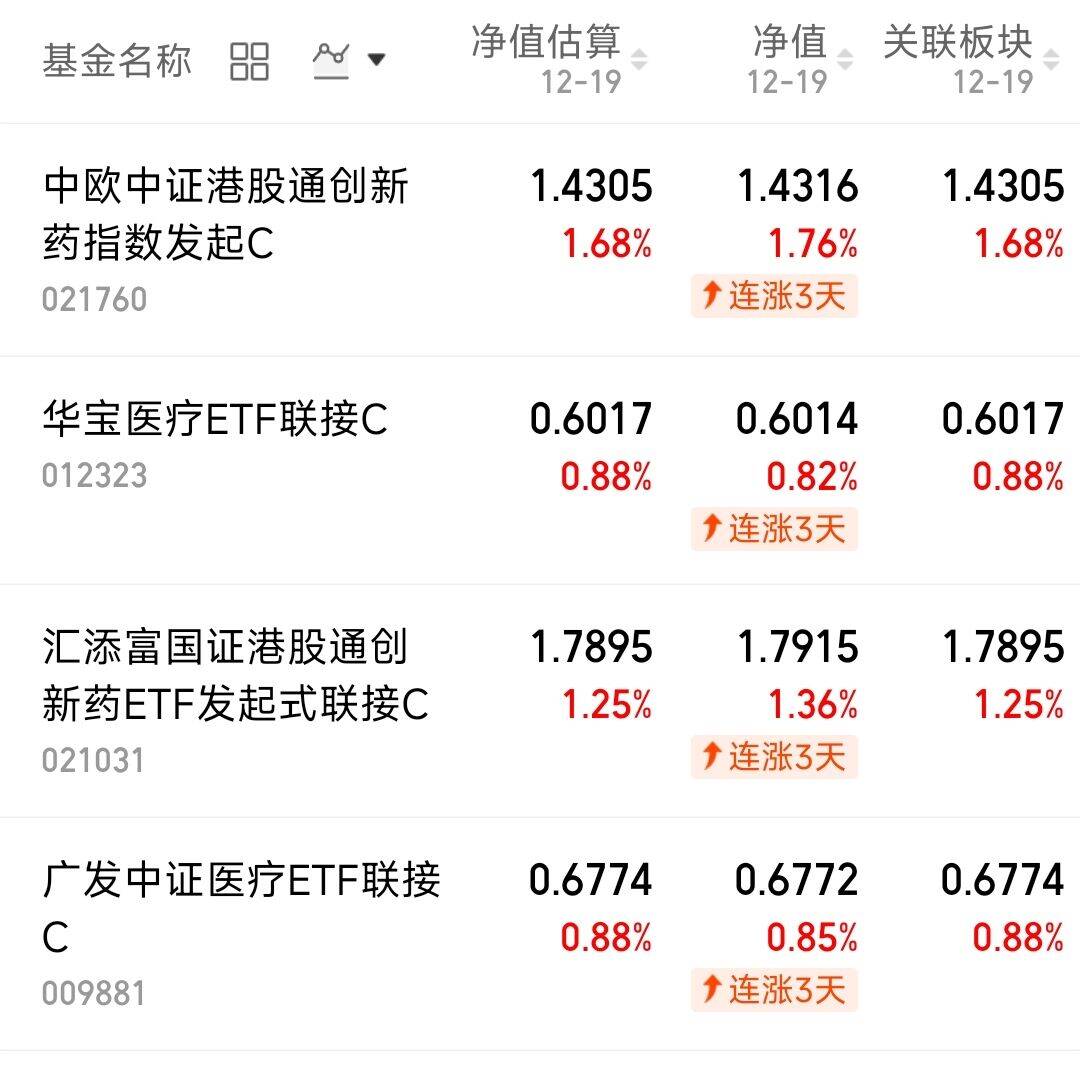 今天的指数继续上攻,虽然说早盘稍微低开了一下,但没有出现较大的回落,尤其是港股那边没有像前面几个交易日出现回落,证券带头拉升情绪面好转起来。中欧中证港股通创新药上涨1.76%,创新药的弹性还是比较高的,$华宝医疗ETF联接C(OTCFUND|012323)$上涨0.82%,$汇添富国证港股通创新药ETF发起式联接C(OTCFUND|021031)$上涨1.36%,$广发中证医疗ETF联接C(OTCFUND|009881)$上涨0.85%。