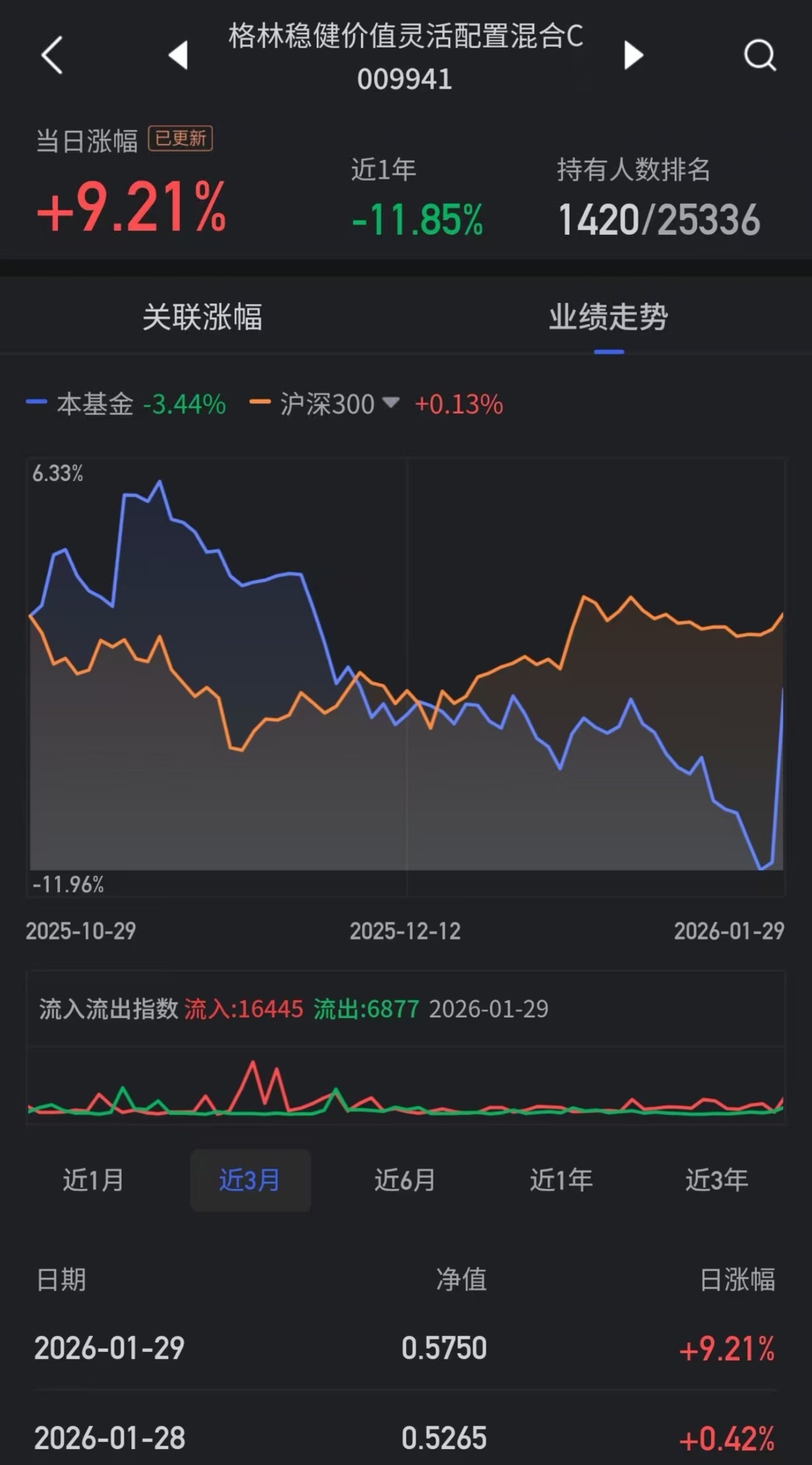 $格林稳健价值混合C$ (009941)今日净值更新后大涨9.21%,该基金主要布局白酒龙头个股,其持仓重仓股前十包括今世缘、迎驾贡酒、贵州茅台、五粮液、山西汾酒、泸州老窖、洋河股份、古井贡酒、舍得酒业和酒鬼酒,今天除了茅台,其他个股全部涨停,可以看出今天有大资金进场低位的白酒了,说明临近年底资金看好消费白酒反弹空间,目前白酒还在低位,花絮接下来会继续分批布局。