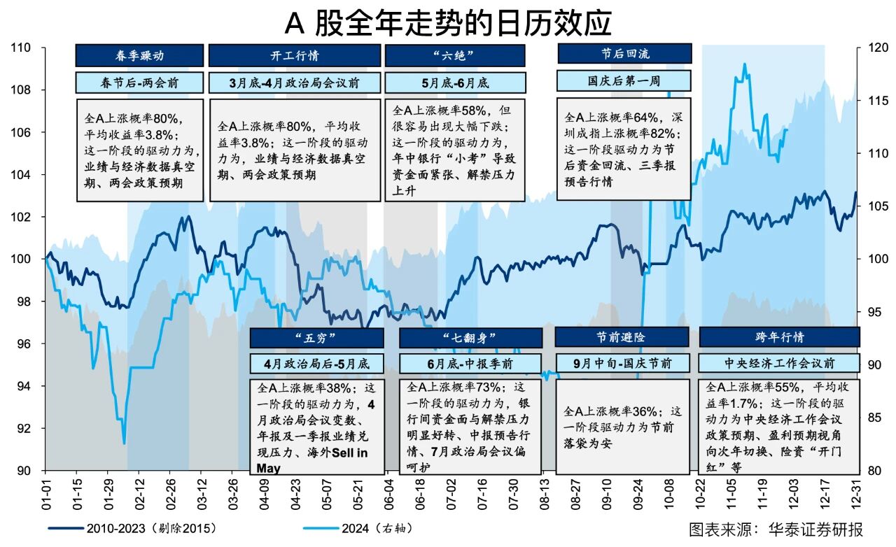 华泰证券研报显示,2010年以来的跨年行情,平均持续37天,最短18天,最长76天。之所以高点往往发生在12月,主要是对当月的重大经济工作会议预期、上市公司来年盈利改善预期,以及保险行业每年“开门红”利好的憧憬。