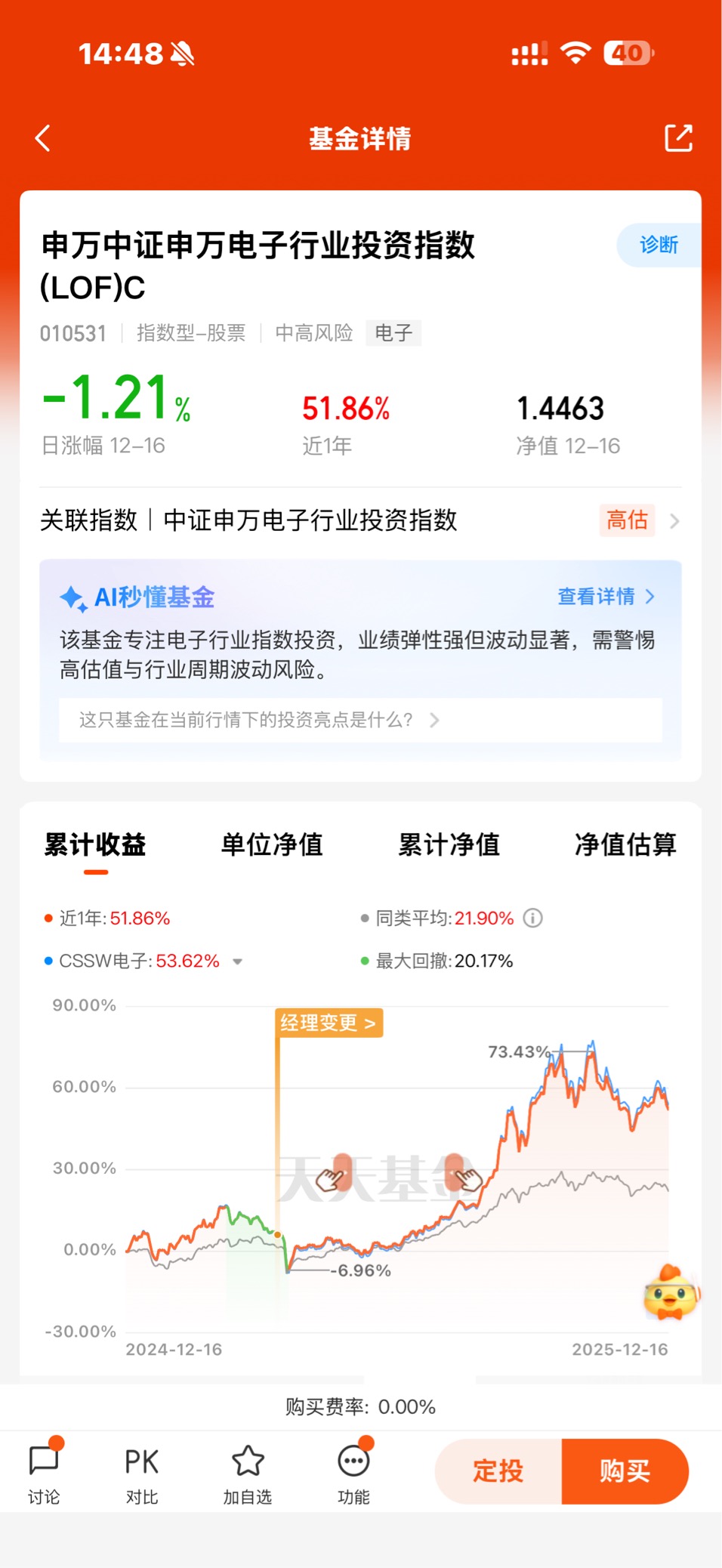 手里景顺长城电子最近没动静,挪了一部分到申万菱信中证申万电子指数C,这是一只密切
