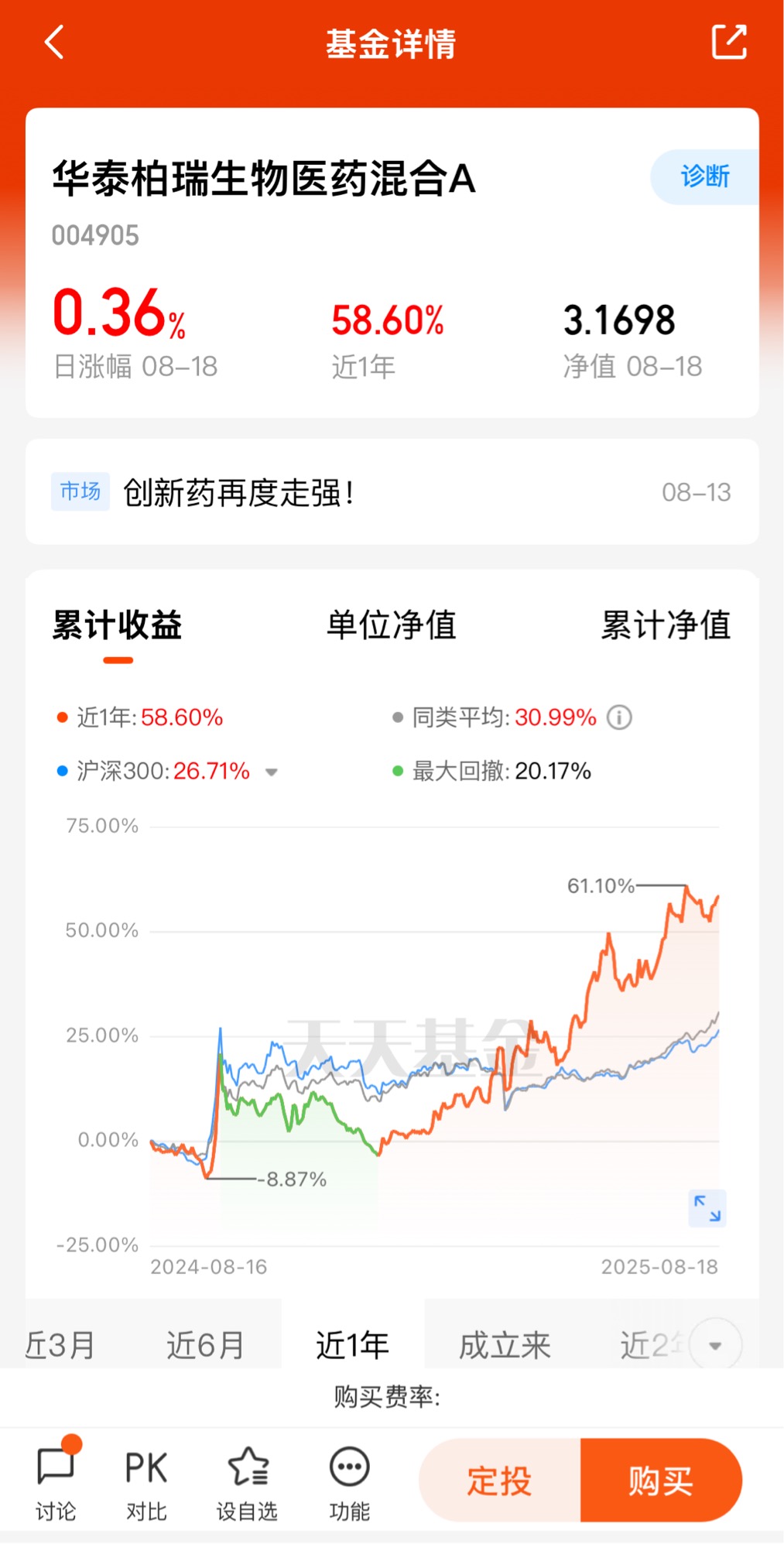 华泰柏瑞生物医药混合A(004905)自2017年成立以来,累计净值走势优于同类平均水平,近3年排名处四象限优秀位。