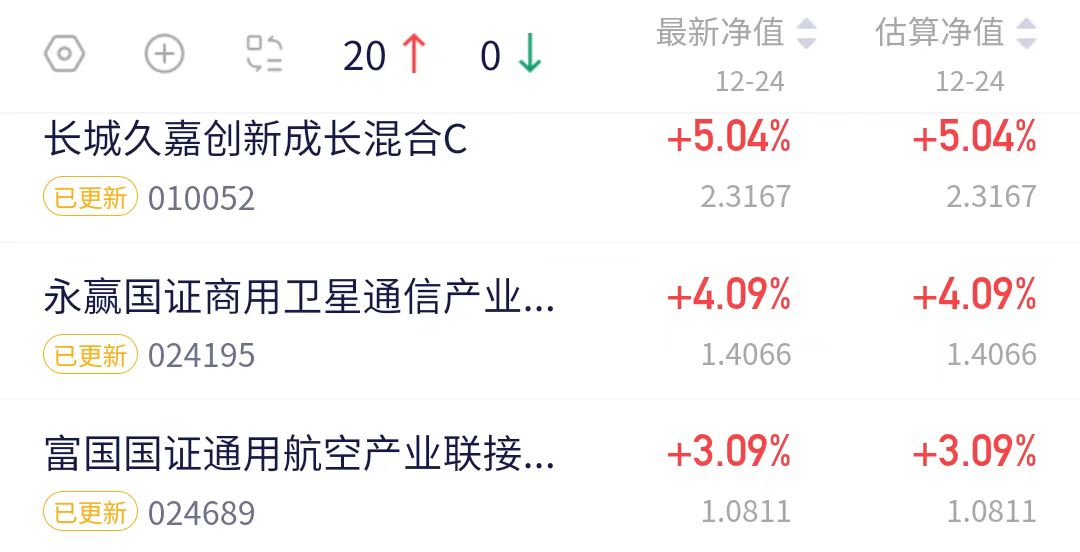最近股市行情持续反弹,商业航天强势上涨,我感觉就是新晋年末主线啊,$长城久嘉创新成长混合C(OTCFUND|010052)$今天上涨5.04%,期待再次8连涨。