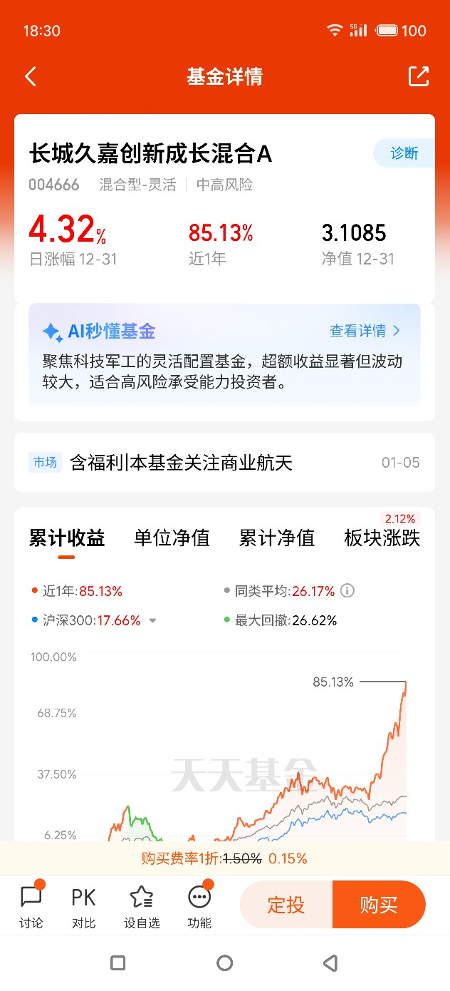 深入了解后,长城久嘉创新成长混合C的核心优势更是让我坚定了持有信心。最让我认可的是它精准的投资方向,基金聚焦中国经济转型中的创新成长主题,重点布局技术创新、产品创新、商业模式创新相关领域,既涵盖了当前热门的商业航天赛道(标的占比约20%),也覆盖了光伏、风电等新能源优质资产,形成了“多元创新+高端制造”的均衡布局。这种布局既踩中了国家产业升级的大趋势,又通过行业分散降低了单一赛道波动的风险,完美契合我“长期布局、稳健求进”的投资理念。