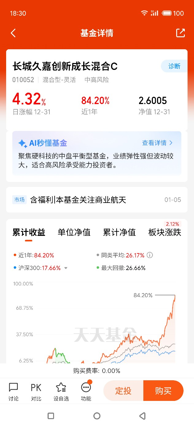 作为一名持有长城基金多年的老基民,这些年跟着长城基金走过牛市的澎湃,也扛过熊市的震荡,实实在在的投资体验让我对这家基金公司产生了深深的信赖。从最初入手的货币基金到后来的债券基金、混合基金,长城基金始终以专业的运作、稳健的业绩,帮我实现了财富的稳步增值。2026开年之际,在反复研究市场趋势和产品质地后,我果断将$长城久嘉创新成长混合C$ (010052)纳入核心持仓,不仅创建了每月定投计划,更愿意把这只优质基金推荐给每一位追求长期收益的投资者。