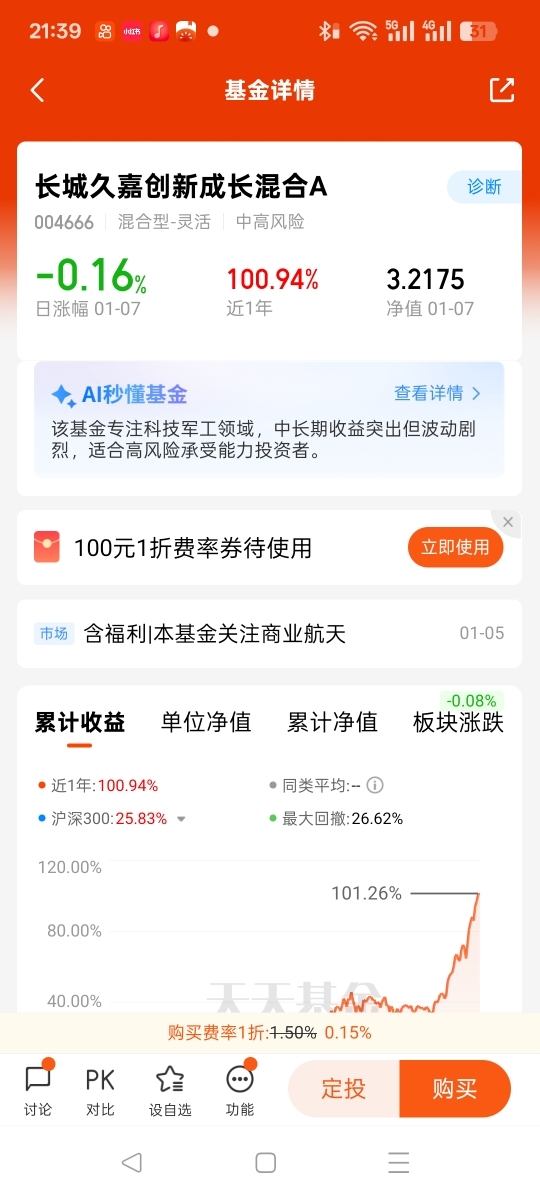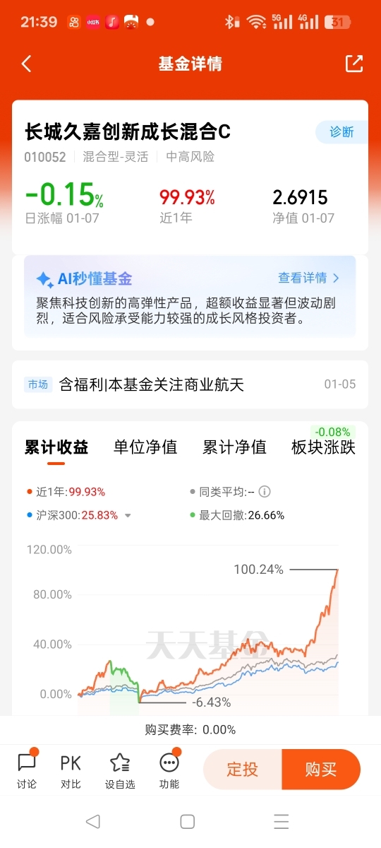 #商业航天嘉速启航# 作为普通投资者,我觉得$长城久嘉创新成长混合C$ 是一只风格特别鲜明的偏股基金。它主打科技自立、军工这些创新成长赛道,股票仓位常年保持在九成以上,所以业绩弹性特别足,赶上半导体、军工行情好的时候,收益能甩开不少同类基金。