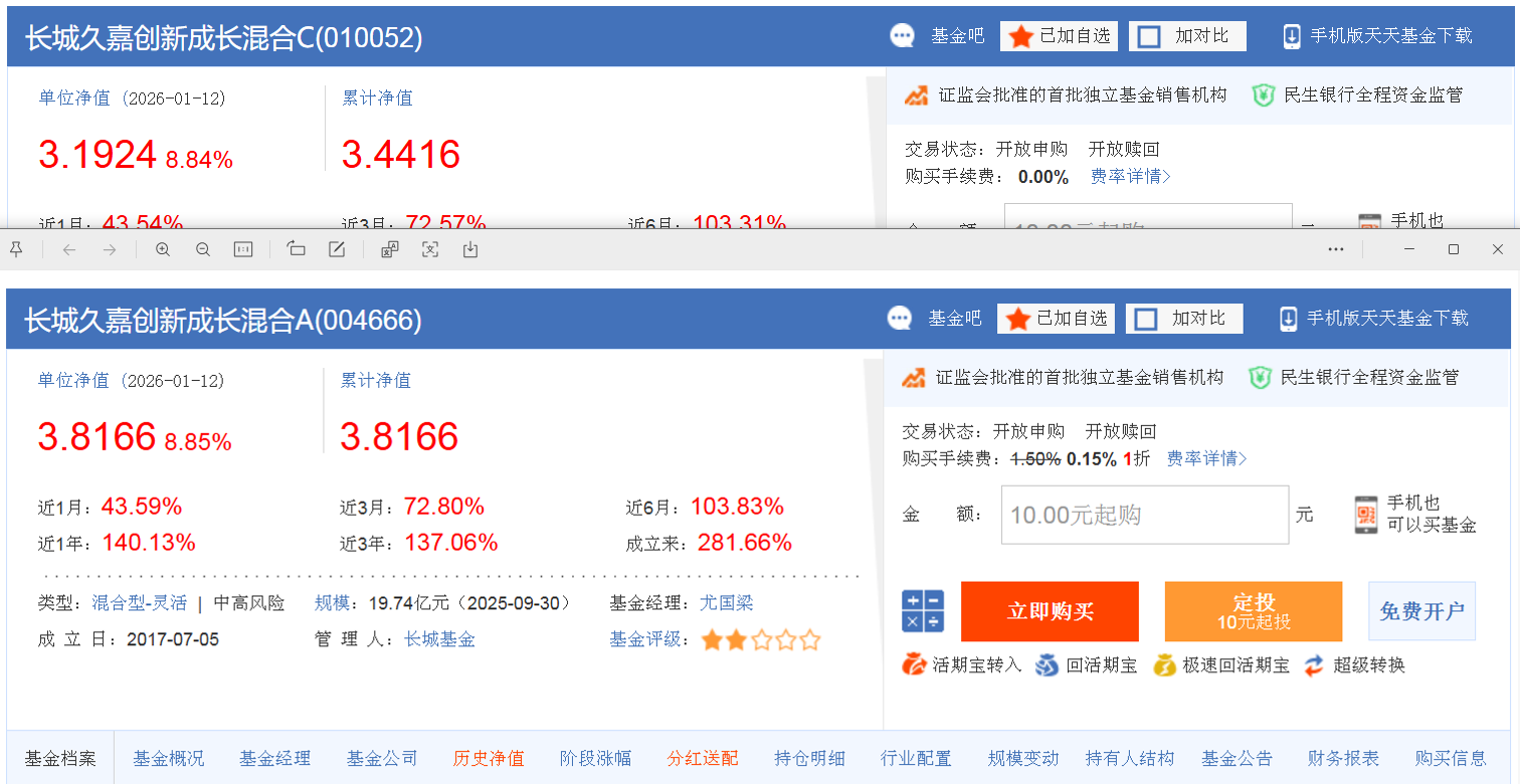 在政策红利、技术突破与资本催化的三重共振下,商业航天正成为 A 股跨年行情的绝对主线。长城久嘉创新成长混合(A 类:004666,C 类:010052)凭借基金经理尤国梁对商业航天赛道的前瞻性布局,近期净值表现亮眼,1 月 12 日单日暴涨8.85%,近 3 个月涨幅达72.80%,近 6 个月涨幅更是高达103.84%。本文将从多个维度对该基金进行全面测评。
