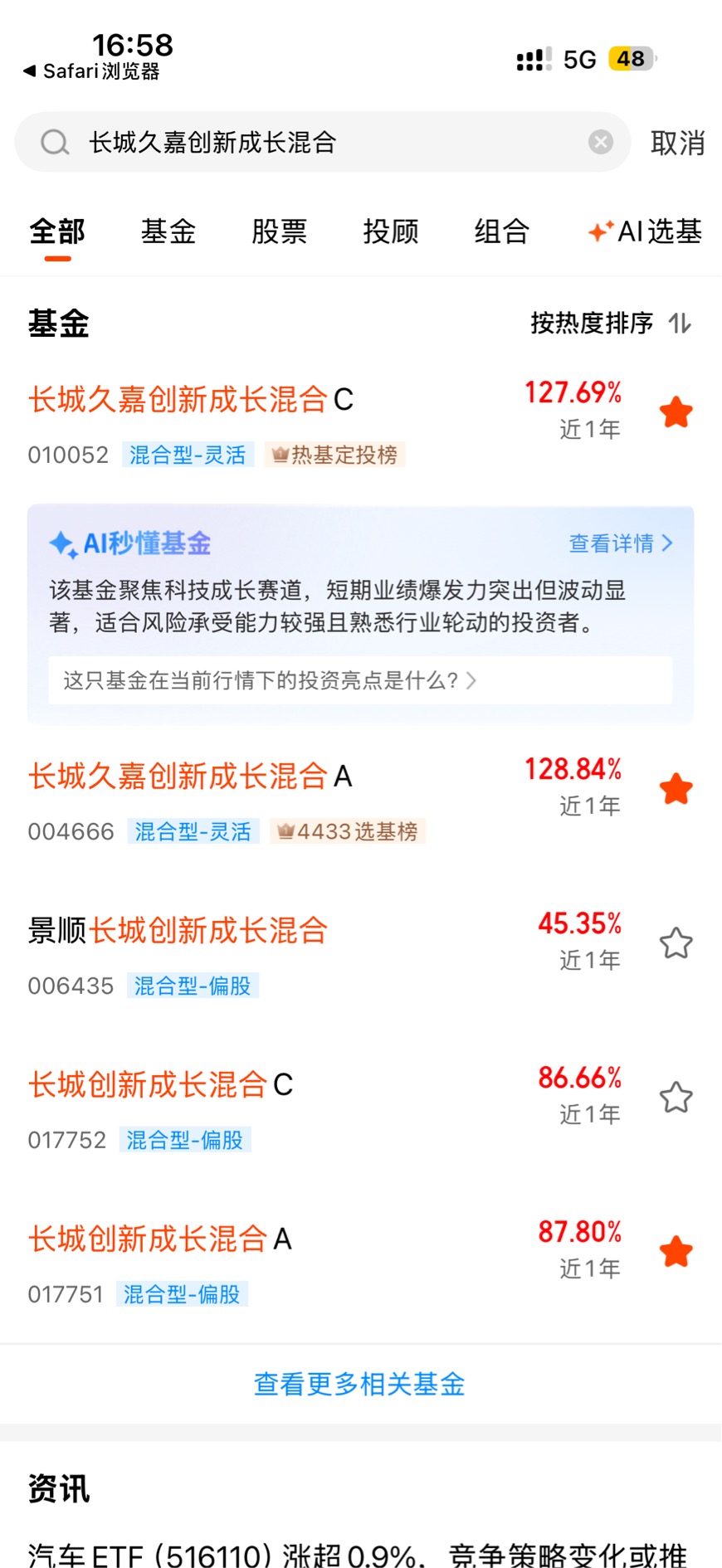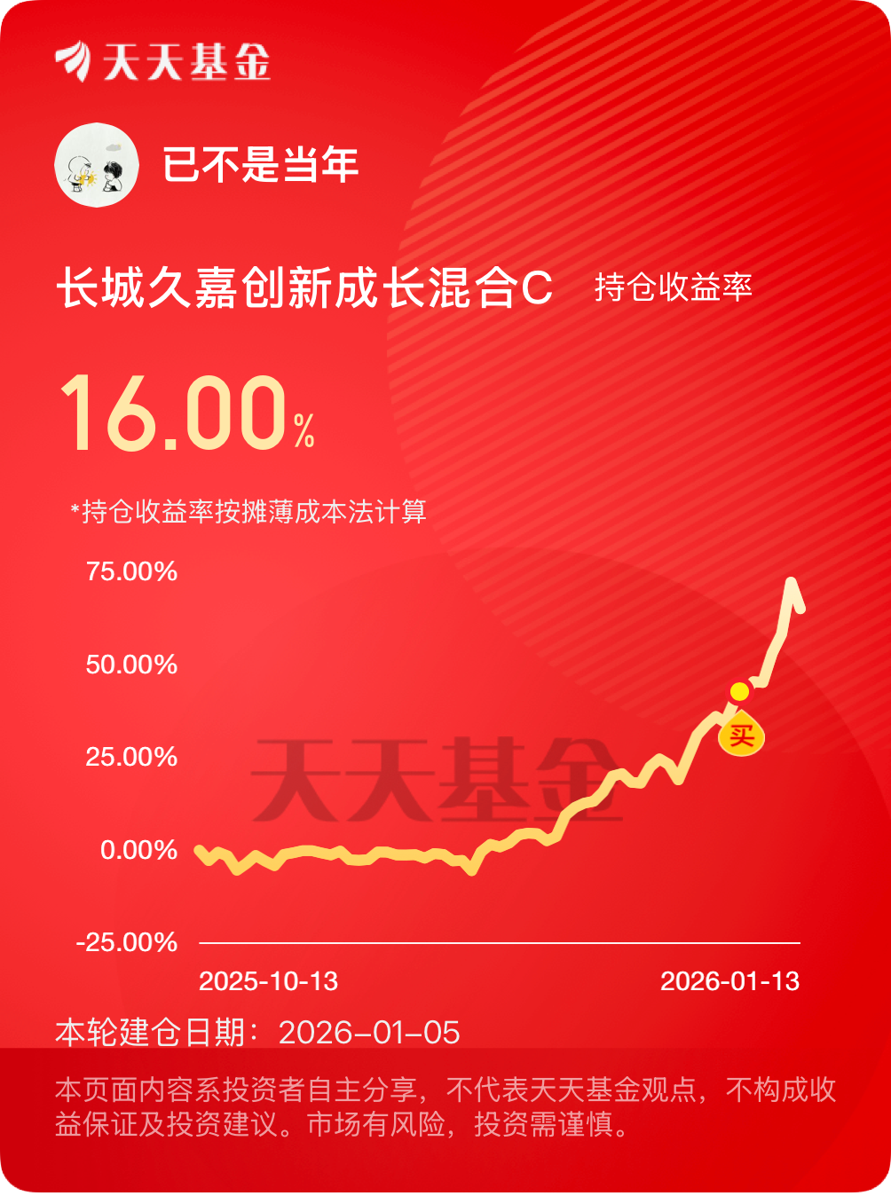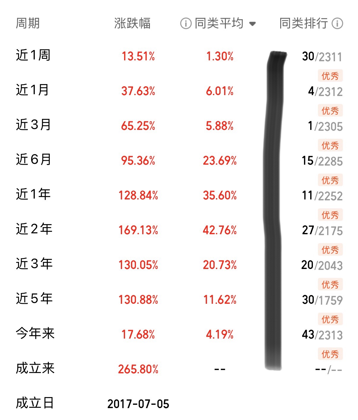从长城久嘉创新成长混合基金本身的业绩表现来看,也确实非常亮眼,给了我一些持有的底气。自2017年七月份成立以来,它的A类份额累计收益率达到了265.80%,轻轻松松跑赢业绩比较基准40.25%,超额收益率高达225.55%。从中短期看,近一年、半年、三个月的收益率分别为128.84%、95.36%、65.25%,不仅都大幅度跑赢了同类型基金,而且在同类基金中都稳居【优秀】评级。可以说,这是一只历史业绩优秀、近期表现突出的主动管理型基金。