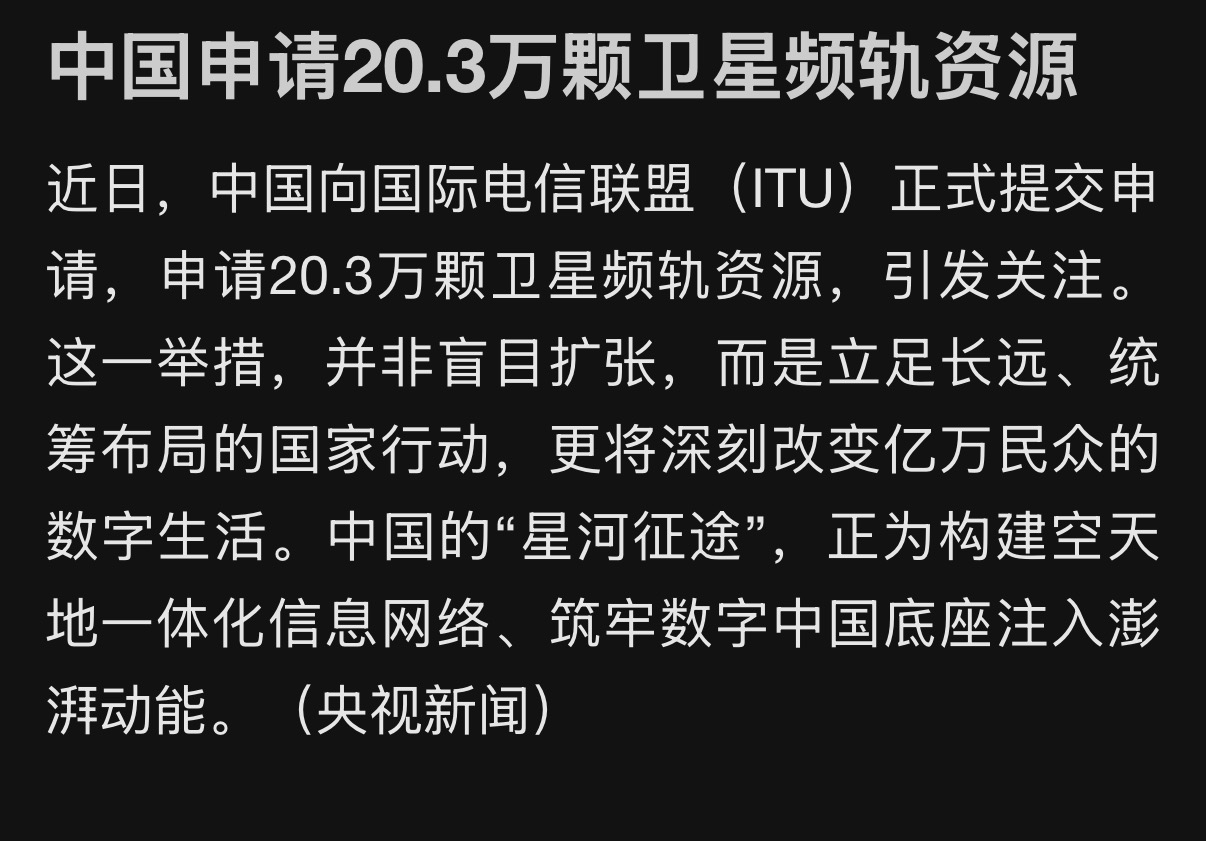 #商业航天嘉速启航# 2026年刚开年,一股前所未有的“太空热”就席卷了全球。这可不是【星际迷航】里的电影场景,而是真切切发生在我们眼前的产业革命和资源争夺战。就前两天,中国向国际电信联盟(ITU)一次性提交了涉及约20.3万颗卫星的频谱与轨道资源申请,覆盖14个星座,创下国内单次申报纪录。这个规模是什么概念?它不仅是我国过去申报总量的数十倍,更是直接将全球低轨星座规划的“天花板”抬高了一个量级。明眼人都看得出来,这不再是企业层面的单打独斗,而是国家战略层面的宏大布局,目的就是为未来十到十五年的大规模空间基础设施建设“提前占位”。