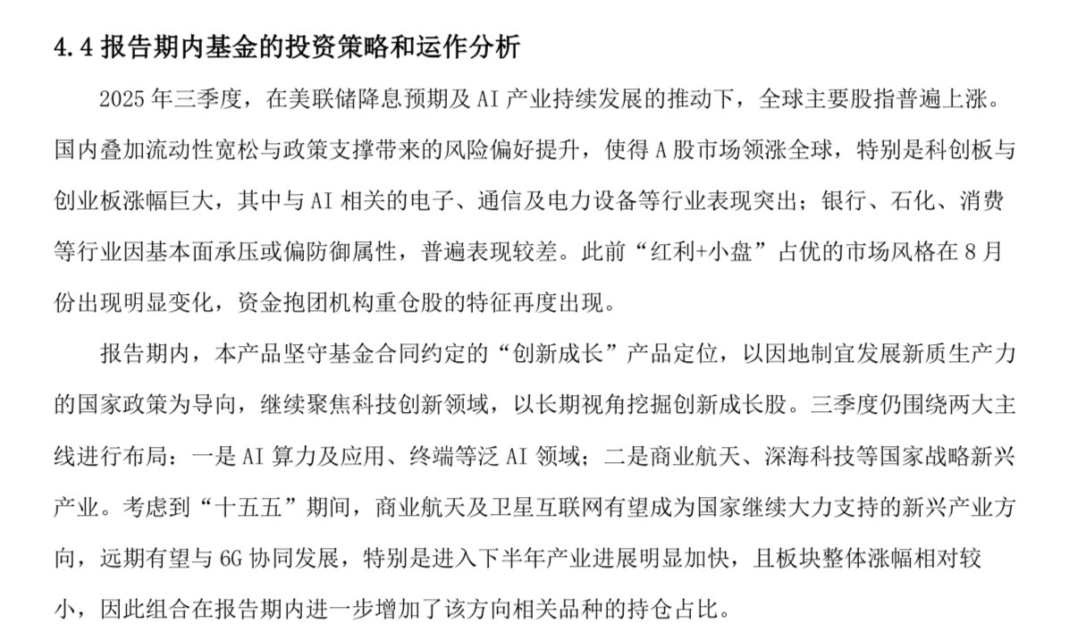 买主动基金,很大程度上就是“买”基金经理这个人。所以,我特别看重定期报告里“投资策略和运作分析”这部分,这是基金经理的“思想汇报”。长城基金的基金经理尤国梁在2025年三季报中就写得非常清晰。他明确产品坚守“创新成长”定位,聚焦科技创新,三季度主要围绕两大主线:一是AI算力及应用;二就是商业航天、深海科技等国家战略新兴产业。更重要的是,他观察到商业航天产业进展加快、而板块涨幅相对较小,因此在三季度进一步增加了这个方向的持仓。这段话传递的信息很关键:首先,他遵守基金合同,策略不漂移;其次,他有清晰的主线,并能根据产业趋势和估值进行灵活的战术调整;最后,这体现了一种冷静的风险意识,在拥抱成长的同时也注重安全边际。这种在科技高波动投资中,兼具战略定力和战术灵活性的风格,让我觉得比较踏实。