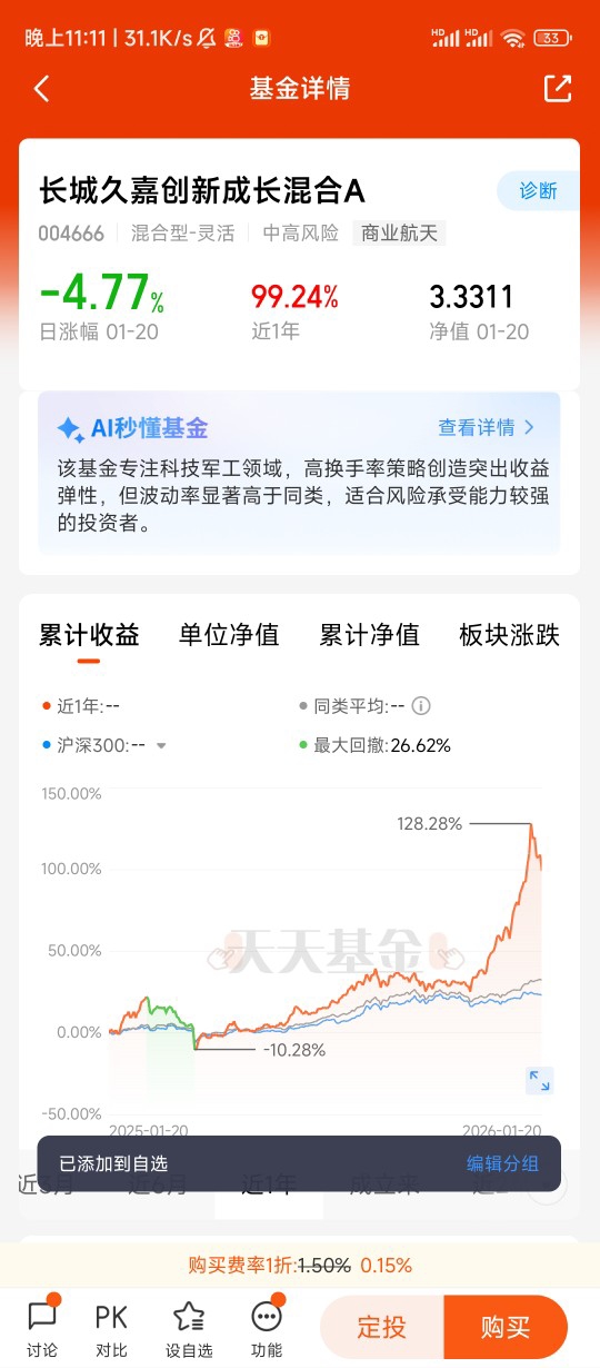 从风险表现来看,基金的短期波动较为明显,例如2026年1月20日单日跌幅达4.77%,近1个月在实现26.64%涨幅的同时,也经历了多次涨跌交替的波动。这种高波动主要源于其高股票仓位以及持仓集中在商业航天等新兴产业的特性——新兴产业处于发展初期,技术迭代快、政策变化多,相关个股的股价波动本身就相对较大。此外,商业航天行业还面临技术突破不及预期、国际竞争加剧、估值回调等风险,这些风险都可能传导至基金净值,导致短期波动。
