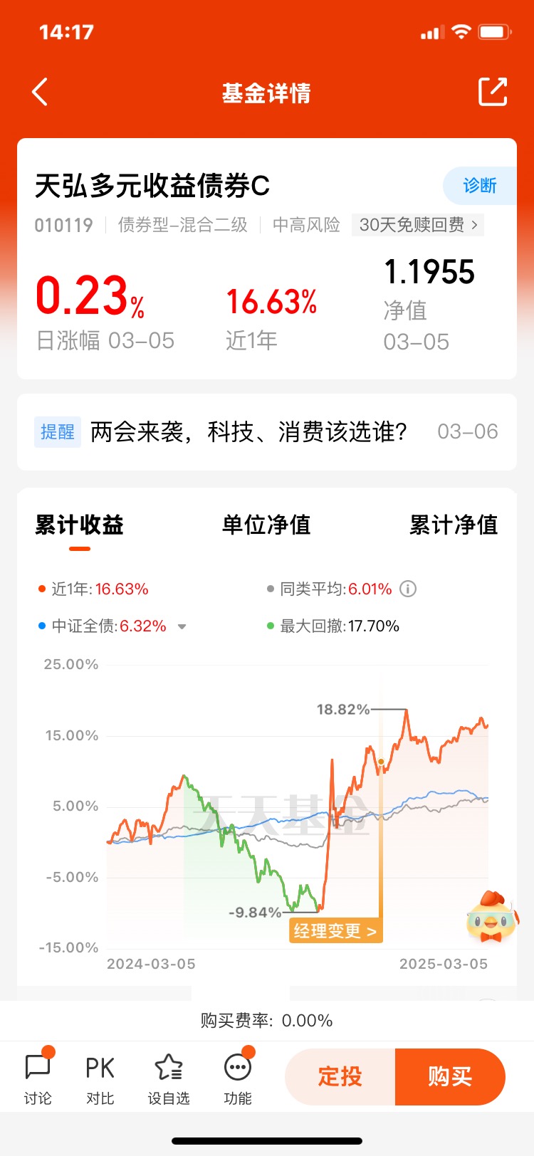 2.核心+卫星配置,将70%-80%仓位作为“核心”持有纯债或低波固收+产品,剩余20%-30%配置天弘多元收益C,平衡收益与风险。