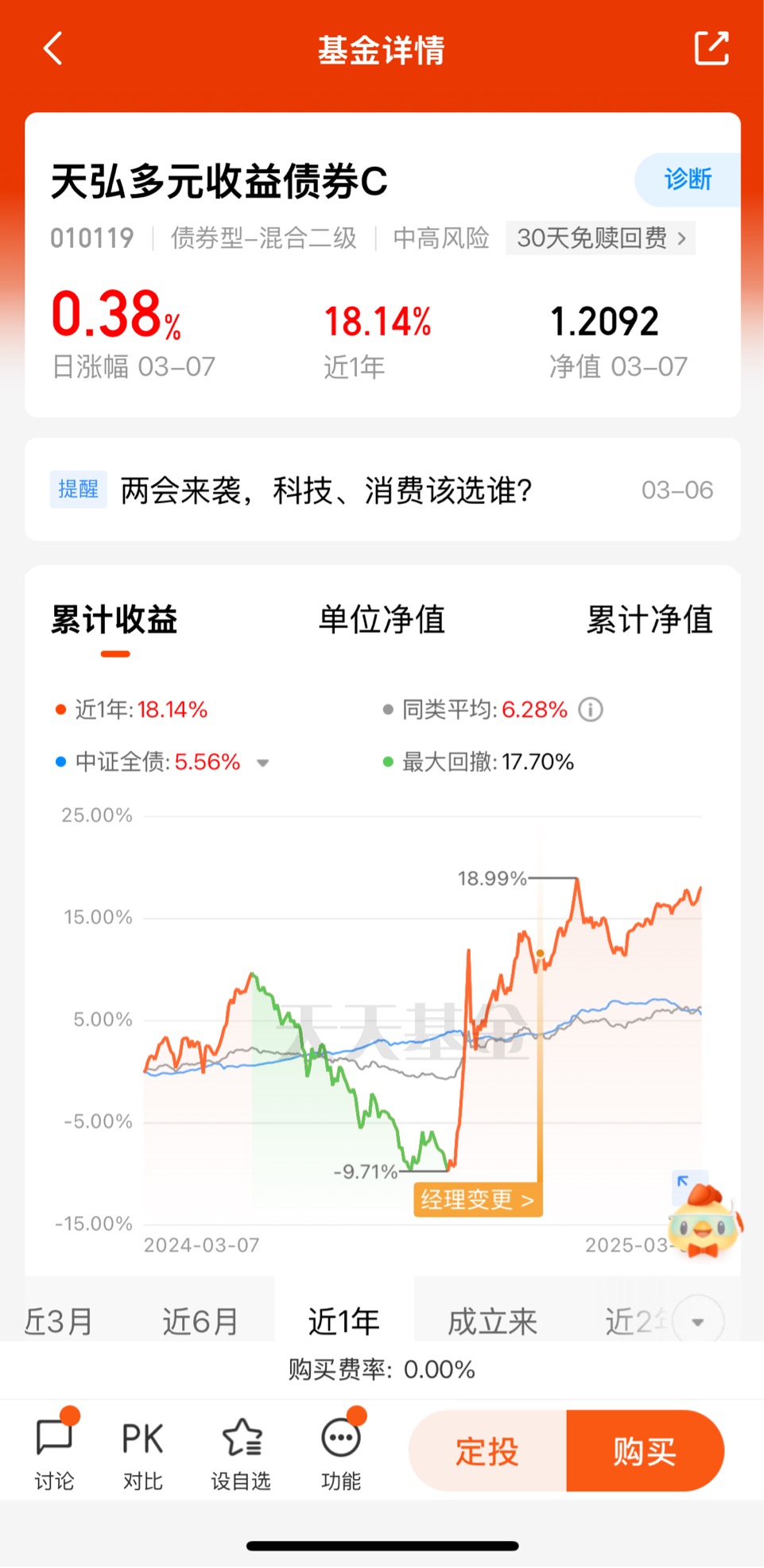 从历史表现来看,天弘多元收益债券C基金在控制风险的同时,实现了相对稳定的收益增长。天弘多元收益债券C近1年获得了18.14%的收益回报,在同类基金中排名前列,这个表现还是非常优秀的。天弘多元收益债券C在追求财富的稳健增值同时,也保证了资产的控风险性。长期来看是一只非常不错的宝藏债基。此外,该基金的性价比也较高。与其他同类基金相比,该基金在管理费用、托管费用等方面相对较低,能够为投资者节省一定的成本。@天弘基金