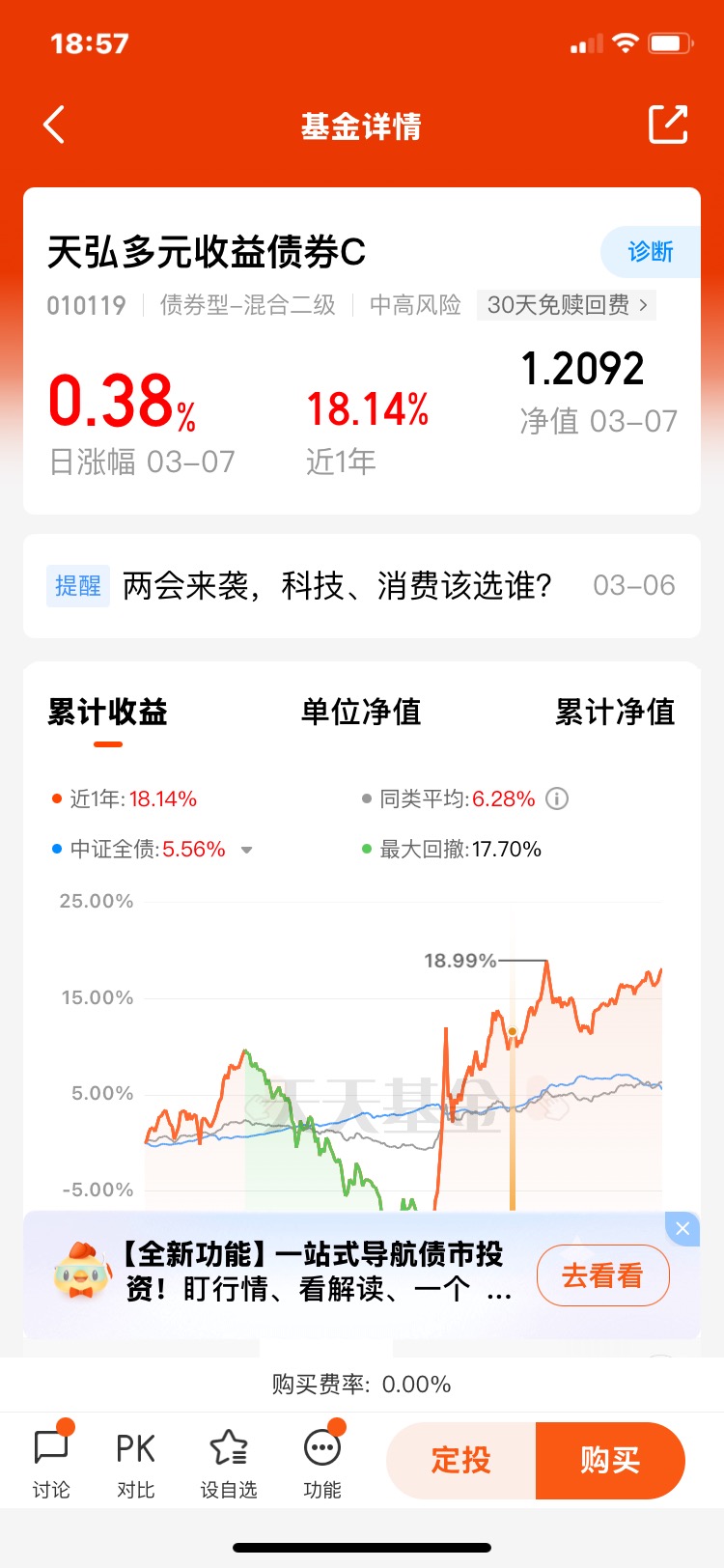 #中国团队AI助手Manus性能超越OpenAI# #女性基金经理突破千人大关# #王坚:AI正在将人类带入一个全新的时代# 看好天弘多元收益债券C! 打卡第17天,2025年开年,资本市场在DeepSeek人工智能概念的催化下迎来结构性行情,权益市场回暖带动转债市场放量上涨,而兼具股债双重属性的“固收+”产品业绩持续发酵。在低利率与政策宽松的宏观环境下,固收+策略因其攻守兼备的特性,成为投资者平衡风险与收益的核心工具。以天弘多元收益债券C为例聊聊我对固收+策略的认识。
