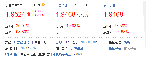 而广发中证稀有金属ETF发起式联接C(019875)则直接切入锂、稀土、小金属等高弹性赛道。其紧密跟踪的中证稀有金属指数,成分股中锂、稀土占比超60%,完美捕捉了新能源和高端制造的需求红利。以稀土为例,今年国家加强出口管制,叠加全球绿色转型推升镨、钕需求,稀土价格中枢持续上移。这只基金近一个月涨20.01%,跑赢大多数科技基金,说明在资源股内部,细分赛道的爆发力更强。