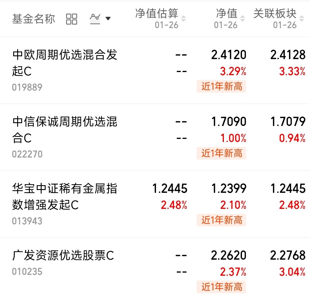有色板块是今年 A 股本轮行情的主线之一,今天更是逆势走强,其中黄金上游资源相关标的涨幅亮眼,推动有色主线继续表现。中欧周期优选混合今日上涨 3.29%,$中信保诚周期优选混合C(OTCFUND|022270)$上涨1%,$华宝中证稀有金属指数增强发起C(OTCFUND|013943)$上涨2.1%。
