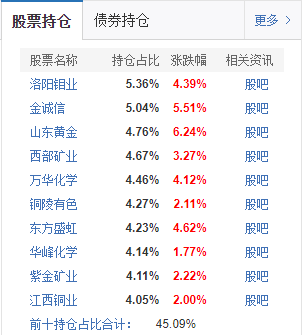 今天化工有色板块集体大涨,$广发资源优选股票C$(010235)成份中的山东黄金涨超6%、金诚信大涨超5%,洛阳钼业、东方盛虹也涨超4%。这只基金化工+有色双线布局,正好契合了当下的市场热点。