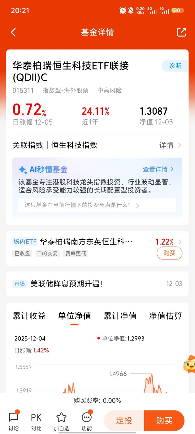 谁懂啊!今天恒生科技又是上涨的一天,从开盘5592点一路往上走,最终涨了0.84%,最近这波动越来越稳,明显是在慢慢往上走的趋势~ 要知道恒生科技覆盖的都是AI、新能源车这些高成长赛道,成分股都是有技术壁垒的硬角色,现在估值还处于历史低位,后续修复空间很大。不想错过这波行情又怕麻烦的,一定要看看华泰柏瑞!它不用你盯盘分析,直接跟着指数复制走势,场外申赎方便,门槛也低,几百块就能买。对于没时间研究基金、又想布局科技板块的朋友来说,这种省心又贴合行情的产品,闭眼入都不踩雷,长期拿着绝对有惊喜