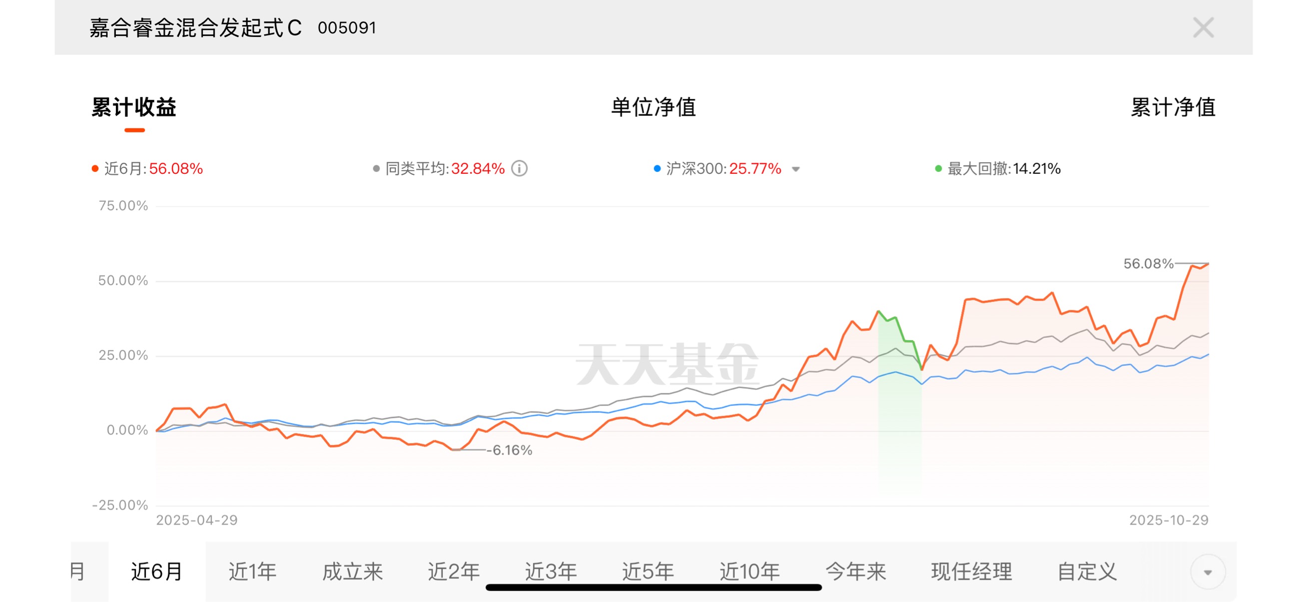半导体产能扩张周期长,CPO和存储芯片短期供需紧张,价格持续涨。嘉合睿金混合C早有布局,近六个月56.08%,有朋友一周就赚了10个点。