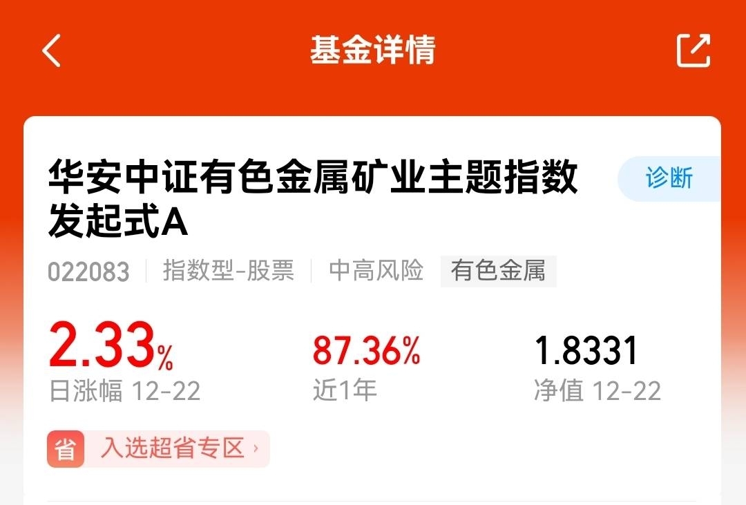 对比发现华安中证有色金属矿业主题指数A是真强!100% 纯有色配置,近 1 月涨 11.37%、近 1 年涨 87.36%,0 折申购果断加仓