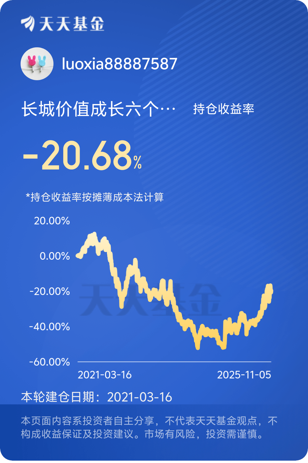 持有好几年还亏20%多,是不是该割肉调基呀,太惨了,这个基金经理是要背因果报应的,亏了这么基民的钱。$长城价值成长六个月持有期混合A$ #晒收益#