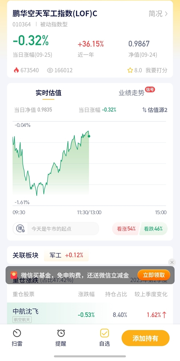 7. 鹏华空天军工指数(LOF):昨天涨0.97%,今天跌0.32%,空天军工这波小回调,别慌,看看后面能不能接着冲。