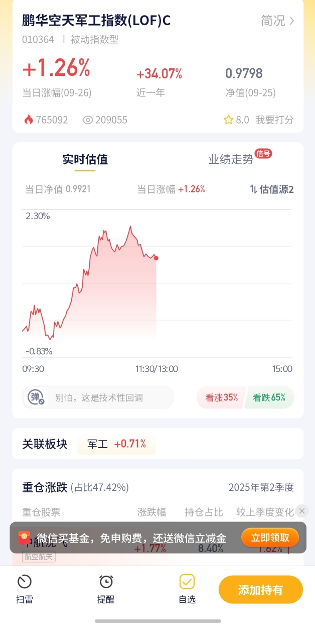 4. 鹏华空天军工指数(LOF):昨天跌0.70%,今天估算涨1.26%,空天军工指数今天发力了,持有它的朋友今天可以喘口气。