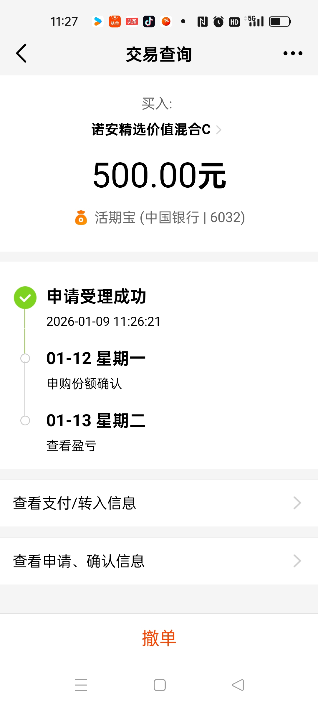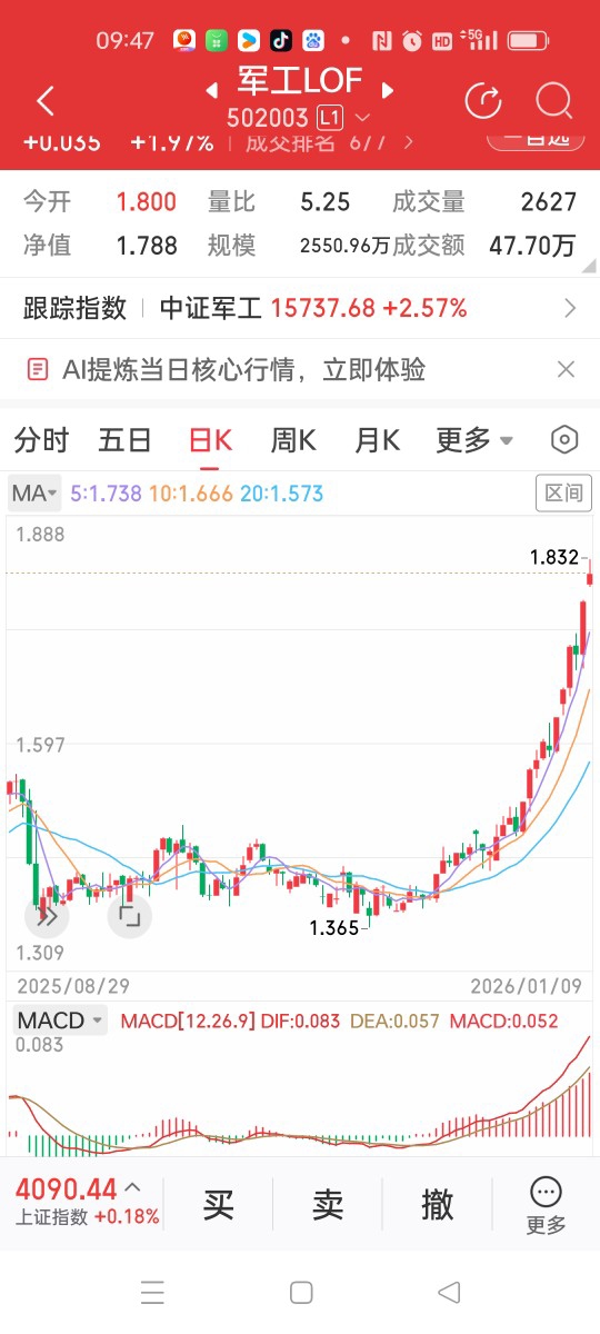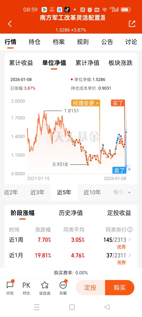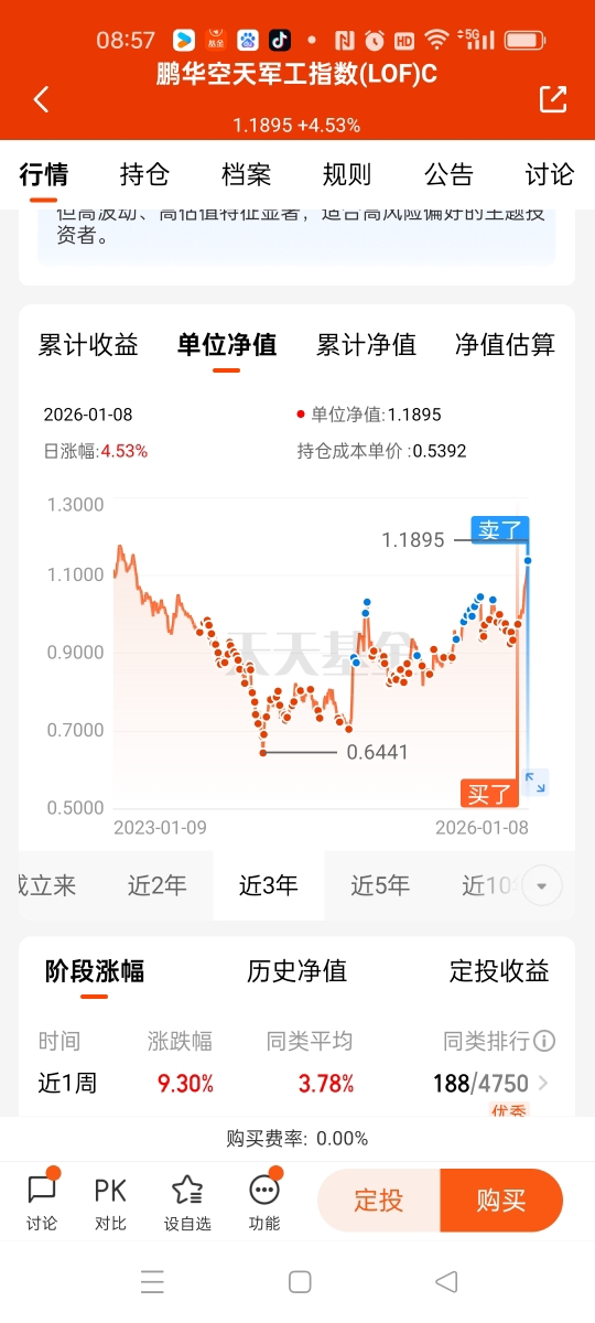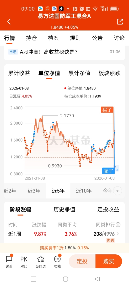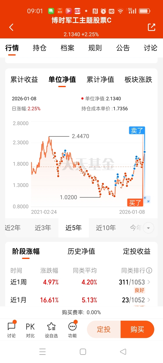 我在周三的尾盘曾抛过一单军工基金的份额,但是不多的,约四分之一和五分之一的仓位吧,看来这单抛出是做错了,昨天周四又涨起来了,幸好还有大部分持仓仍留着。