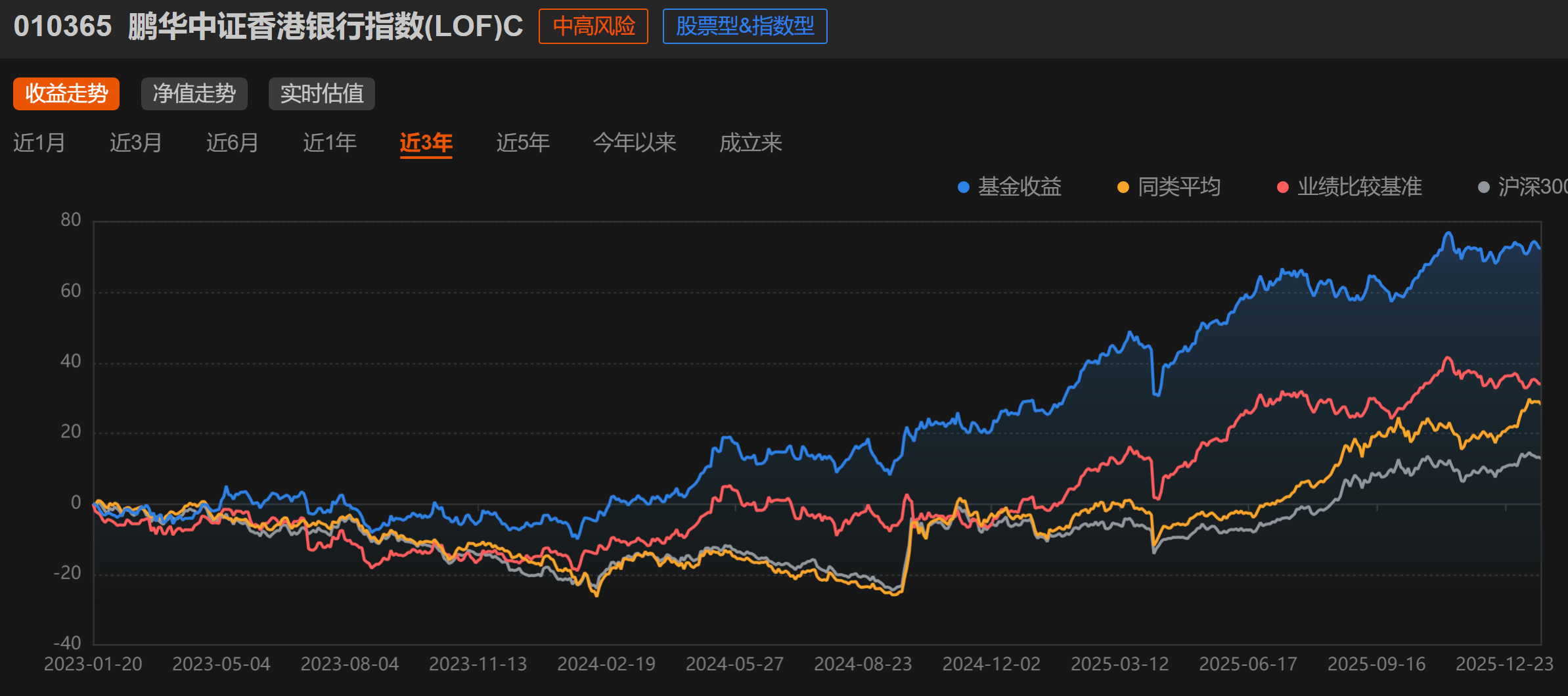 基于以上分析,今天想和大家重点聊聊$鹏华香港银行指数(LOF)C$(010365)这个工具。为什么在当下市场环境下推荐这个产品?核心逻辑其实很简单——震荡行情,遇事不决香港银行。首先,从工具属性看,这只基金跟踪的是中证香港银行投资指数,成分股包括汇丰控股、建设银行、工商银行、中国银行等香港上市的大型银行,这些银行通常具有稳健的资本充足率、成熟的经营模式和稳定的分红传统,盈利稳定性较强。作为被动指数基金,它能够精准复制指数表现,避免主动管理带来的风格漂移风险,同时LOF结构流动性较好,便于投资者根据市场情况灵活调整仓位。其次,从估值角度看,当前香港银行板块的市净率(PB)处于历史相对低位,部分银行股甚至跌破净资产,而股息率普遍在5%-7%之间,在低利率环境下具有明显的吸引力。即使股价短期不涨,高股息也能提供一定的安全垫,这在当前市场波动加剧的环境下尤为重要。第三,从配置价值看,香港银行板块与A股银行、美股金融股的相关性相对较低,可以作为资产组合中的分散化工具,降低整体组合的波动性。特别是在当前全球市场不确定性加大的背景下,这种低相关性资产的价值更加凸显。最后,从时机选择看,2026年一季度通常是银行板块的业绩释放期和资金配置窗口期,叠加美联储降息预期、南向资金持续流入等因素,板块有望迎来阶段性修复机会。