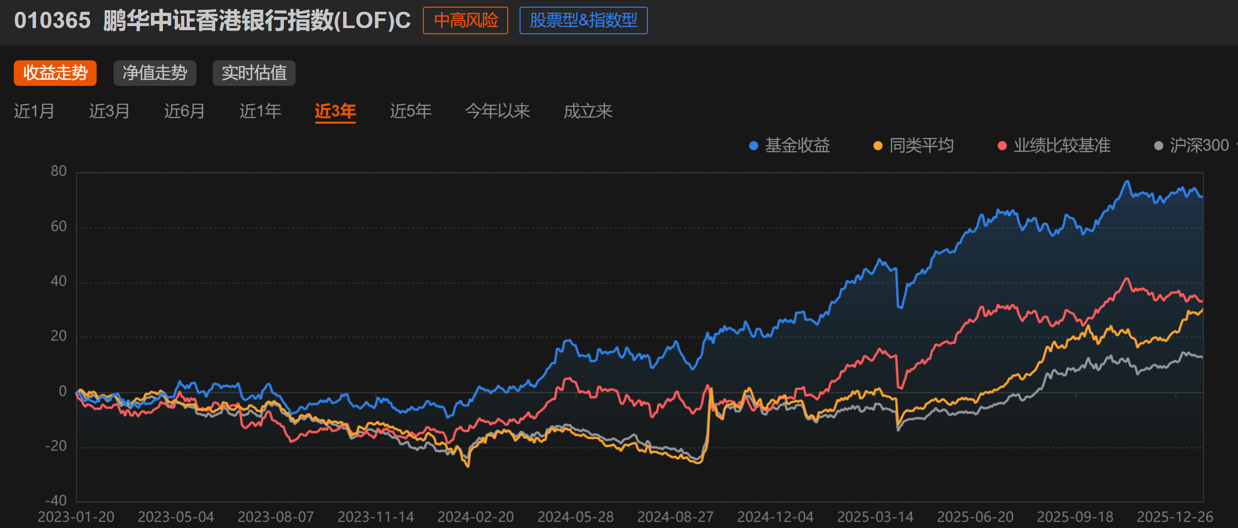综合来看,在当前市场方向不明、波动放大的环境下,香港银行板块凭借低估值(PB仅0.71倍,处于近十年39%分位数)、高股息(股息率6%以上)、以及稳健基本面,成为震荡行情中的“压舱石”。对于普通投资者,直接选股难度较大,借道指数基金分散配置是更优选择。以$鹏华香港银行指数(LOF)C$(010365)为例,该基金覆盖汇丰、渣打、中银香港等20只港股银行龙头,能高效捕捉板块整体表现;其近一年累计分红每份0.23元,股息率约4.5%,在低利率环境下具备吸引力。当然,需注意潜在风险,如净息差进一步收窄、地产敞口压力等,建议采取分批建仓策略,避免追涨杀跌。