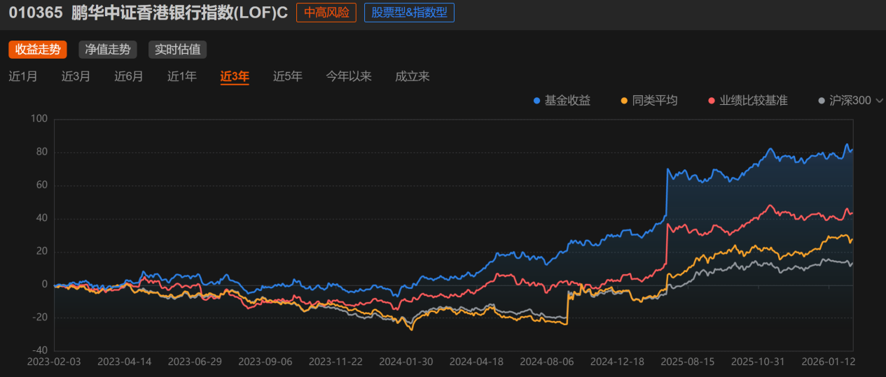 最后说说具体的投资工具。如果大家想配置香港银行板块,但又不想单押个股,可以考虑指数基金,比如$鹏华香港银行指数(LOF)C$(010365)。这个基金跟踪的是中证香港银行指数,前十大重仓股包括汇丰、建行、工行、渣打这些银行,持仓集中度超过90%,能比较纯粹地反映香港银行板块的整体表现。选择指数基金的好处是分散了个股风险,而且管理费率相对较低,适合长期持有。特别要提醒的是,现在市场处于震荡期,这种时候指数基金定投可能是个不错的策略,通过分批买入平滑成本,避免追高。当然,任何投资都有风险,香港银行板块虽然相对稳健,但也不是稳赚不赔,大家还是要根据自己的风险承受能力来决策。总结一下,在当前这种市场环境下,香港银行板块凭借低估值、高股息、稳健基本面的特点,确实值得关注,特别是对于追求稳健收益、又想参与港股机会的投资者来说,$鹏华香港银行指数(LOF)C$(010365)可能是个不错的配置选择。#现货黄金一度失守4800美元#