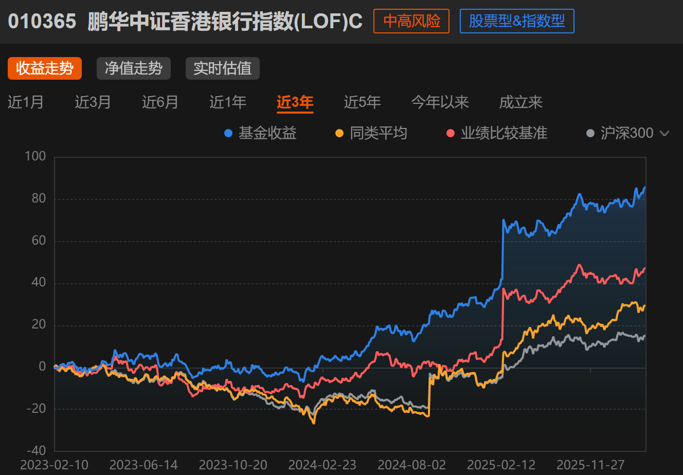 说说具体的投资工具。如果大家想配置香港银行板块,但又不想单押个股,可以考虑指数基金,比如$鹏华香港银行指数(LOF)C$(010365)。这个基金跟踪的是中证香港银行指数,前十大重仓股包括汇丰、建行、工行、渣打这些银行,持仓集中度超过90%,能比较纯粹地反映香港银行板块的整体表现。选择指数基金的好处是分散了个股风险,而且管理费率相对较低,适合长期持有。特别要提醒的是,现在市场处于震荡期,这种时候指数基金定投可能是个不错的策略,通过分批买入平滑成本,避免追高。当然,任何投资都有风险,香港银行板块虽然相对稳健,但也不是稳赚不赔,大家还是要根据自己的风险承受能力来决策。