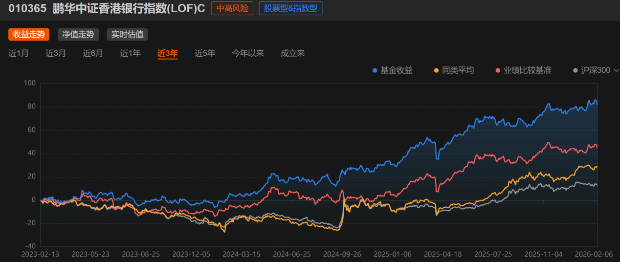 最后说说具体的投资工具,如果你觉得单买个股风险太大,或者没时间研究那么多公司,那$鹏华香港银行指数(LOF)C$(010365)绝对是个不错的选择,它跟踪的是中证香港银行指数,成分股都是像建行、工行这样的,持仓非常集中,能很好地反映整个板块的走势,而且作为LOF基金,它支持场内交易,流动性很好,想买想卖都很方便,不像有些QDII基金那样封闭期长、赎回慢,而且它的管理费率也比较低,长期持有成本可控。#马年首个交易日来了:哪个板块“一马当先”?#
