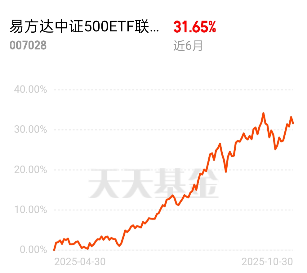 今年主动基金想跑赢指数不容易,连很多专业选手都没跑赢A500。易方达中证500ETF联接A近6个月收益31.65%,指数基金反而更给力。