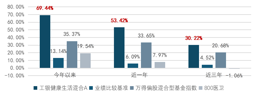 1、该产品历史业绩非常出色。工银健康生活混合A今年以来收益率高达69.44%,同期业绩基准收益为13.14%。今年以来、近一年、近三年收益率均大幅超越业绩比较基准、中证医药卫生指数及万得偏股混合型基金指数。A类近一年收益率排名居同类前1/8(排名来自晨星,截至2025.09.30,同类为“中国 开放式基金-行业混合-医药”,具体排名为23/204)。