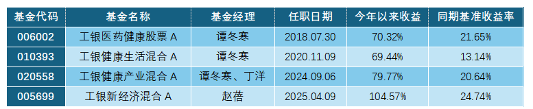 3、工银健康产业混合A成立于2024年9月6日。该基金今年以来、成立以来净值增长率分别为79.77%、62.06%;同期业绩比较基准收益率分别为20.64%、38.78%。基金净值增长率及基准收益率来自基金托管行复核数据,截至2025年9月30日。