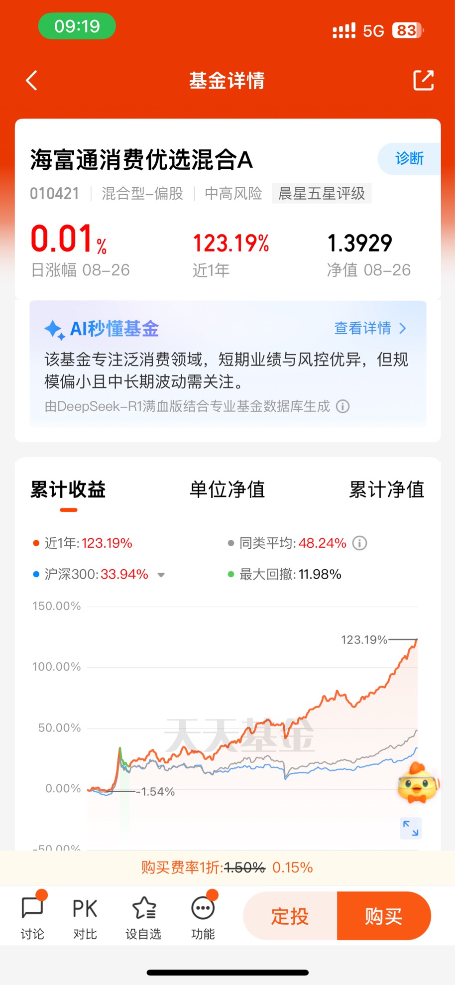 海富通消费优选混合基金成立于2013年,是一只深耕消费赛道的“老基金”,截至2024年二季度,基金规模稳定在8.6亿元,股票仓位长期维持在70%-80%,以“精选消费领域优质企业”为核心策略,业绩比较基准为“中证内地消费指数收益率×80%+上证国债指数收益率×20%”,清晰锚定消费赛道收益。