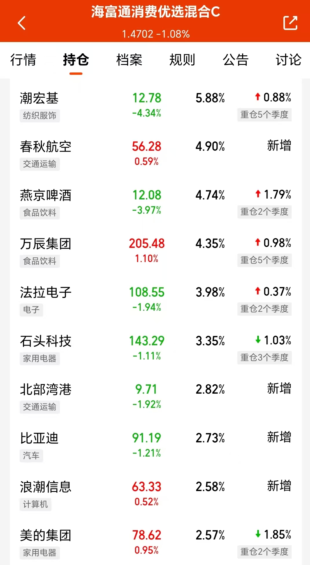 如今消费早已经不是传统的吃吃喝喝。010422 海富通消费优选混合C的持仓也更加多元化。它核心覆盖食品饮料、家电、纺织服饰等刚需赛道,如美的集团、燕京啤酒、潮宏基;卫星布局电子、汽车、计算机、交通运输等,如法拉电子、比亚迪、浪潮信息、春秋航空,捕捉跨界消费机会。实现了“必选守正、可选择机、新消费掘金”的完美搭配。