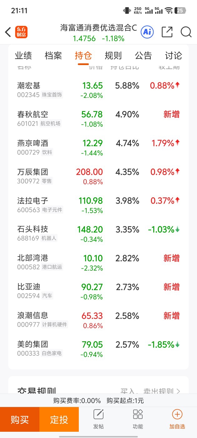 · 不看传统,看新潮: 他没有死守传统的白酒、家电。在他的重仓股里,你能看到潮宏基、万辰集团、燕京啤酒等这些更具年轻化、新消费属性的标的。正如他所说,现在的消费机会更多来自“新趋势、新潮流、新玩法”,比如年轻人喜欢的黄金饰品、零食量贩等。