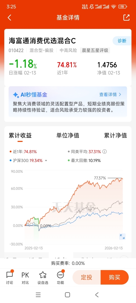 2026年马年春节,9天超长假期点燃全民消费热情,商务部“乐购新春”活动、各地消费券、家电汽车以旧换新等政策密集落地,叠加春运客流、文旅出行、年货采购全面爆发,消费市场迎来政策、节日、需求三重共振。站在当前时间节点,消费板块已成为A股最具确定性的投资主线之一,而聚焦消费赛道的优质基金——海富通消费优选混合C(010422),凭借出色的投研实力、业绩表现与赛道契合度,极具投资价值,本人将坚定看好并积极配置。