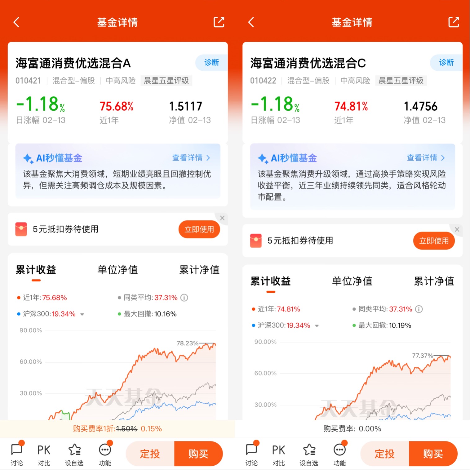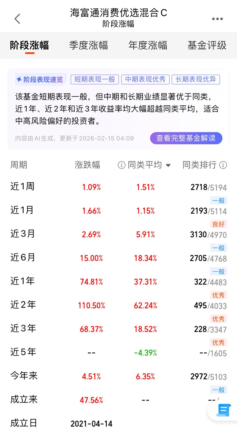 从历史业绩来看,海富通旗下的消费主题基金,整体表现都很出色。比如海富通消费优选A(010421),近1年收益率75.68%,任职回报84.49%,和C类份额几乎一致。这说明,海富通在消费领域的投资能力,是经过长期验证的,而不是靠某一只基金“偶然”爆发。