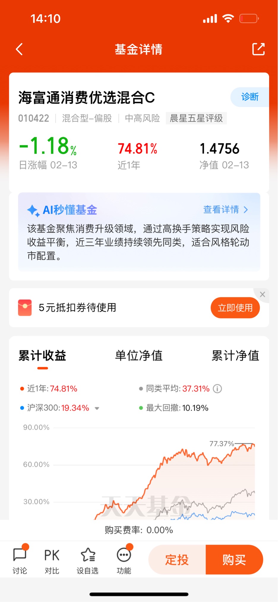 很多人买基金,只看近一年涨了多少,却忽略了最大回撤。但对我这种还没持有、正准备布局的投资者来说,回撤控制才是决定我能不能拿得住的关键。试想一下,如果一只基金涨得快,但跌起来也快,比如从1块涨到2块,又跌回1.2块,我大概率会在恐慌中割肉;但如果一只基金涨得稳,跌得浅,比如从1块涨到1.8块,只跌到1.5块,我反而能安心持有,等到下一轮行情。海富通消费优选C就是后者。近1年最大回撤10.19%,远低于中证消费指数同期16.8%的跌幅,这意味着在消费板块回调的时候,它的净值修复速度更快,跌后恢复天数只有14天,优于99%的同类。这种“涨得快、跌得少、修复快”的特质,不是靠运气,而是靠基金经理的主动管理能力。