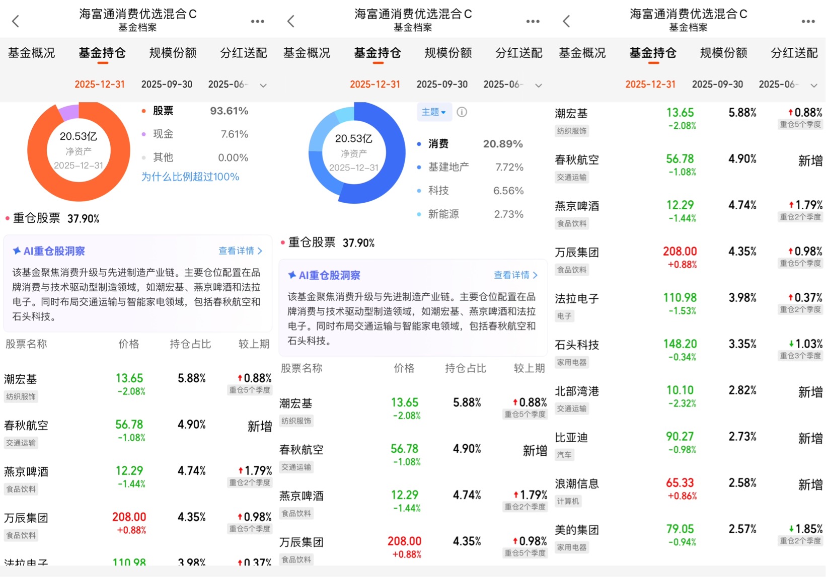打开基金的持仓页,你会发现它和传统消费基金很不一样。前十大重仓股里,既有潮宏基(纺织服饰)、春秋航空(交通运输)、燕京啤酒(食品饮料)、万辰集团(食品饮料)这些典型的消费龙头,也有法拉电子(电子)、石头科技(家用电器)、浪潮信息(计算机)等科技股。行业配置上,消费占20.89%,基建地产7.72%,科技6.56%,新能源2.73%,前三大行业合计占比23.5%,远低于同类基金动辄40%以上的行业集中度。
